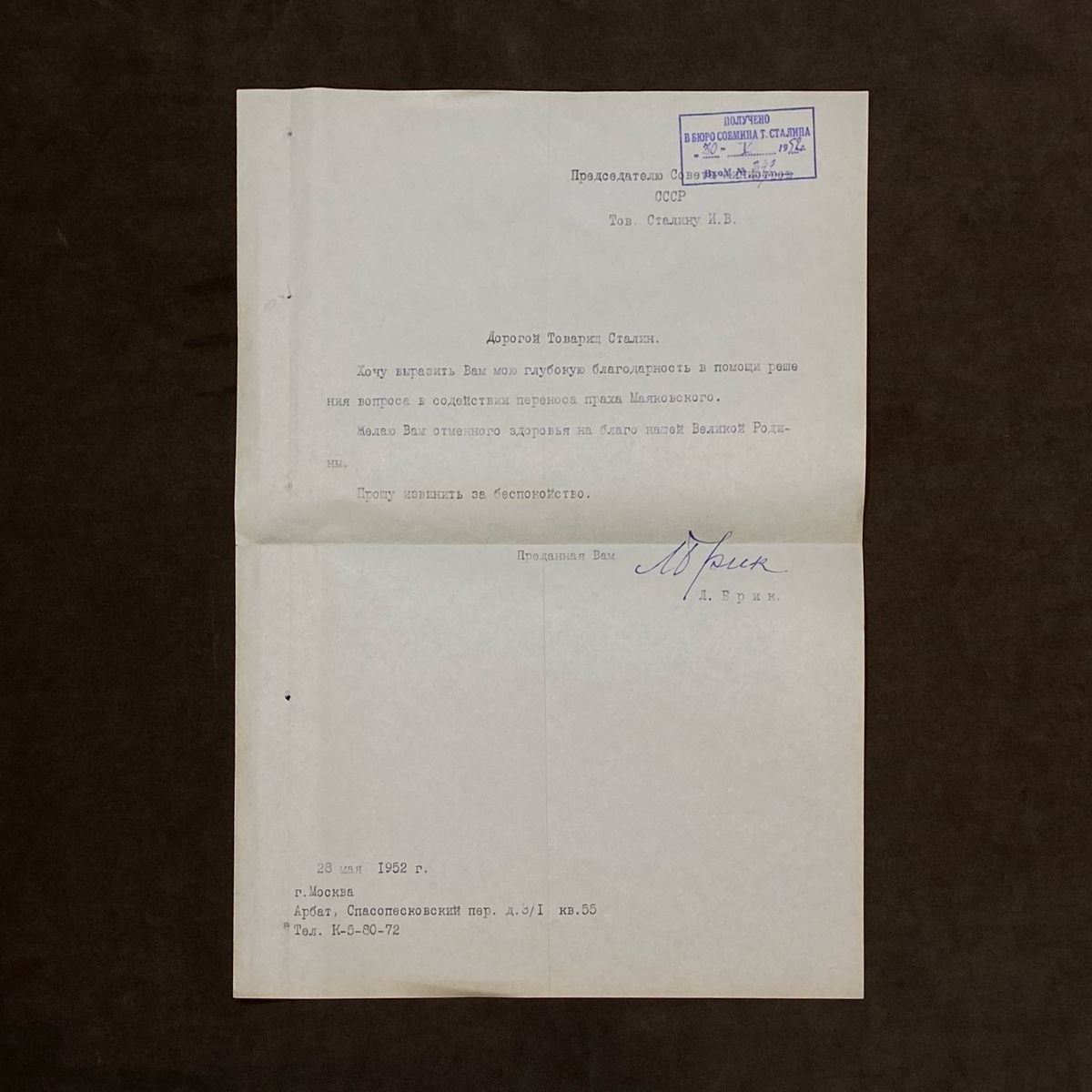 Письмо, представленное в коллекции Stargift, датировано 28 мая 1952 года и адресовано Иосифу Сталину. Оно относится к завершающему этапу многолетних усилий Брик по достойному увековечиванию памяти поэта. После кремации в 1930 году прах Маяковского первоначально хранился в колумбарии Нового Донского кладбища, а его мозг был передан в Институт мозга для исследований. Благодаря настойчивости Лили Брик и сестры поэта Людмилы 22 мая 1952 года урна с прахом была торжественно перенесена на Новодевичье кладбище.