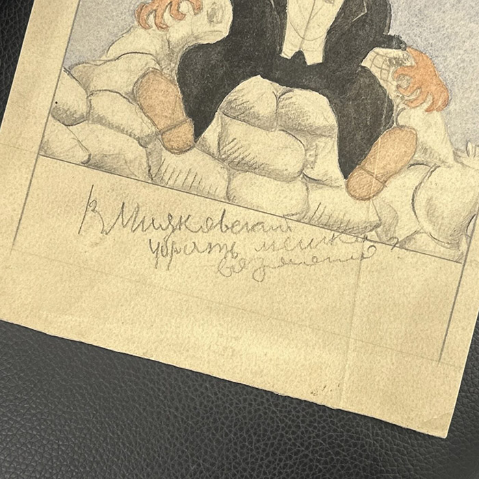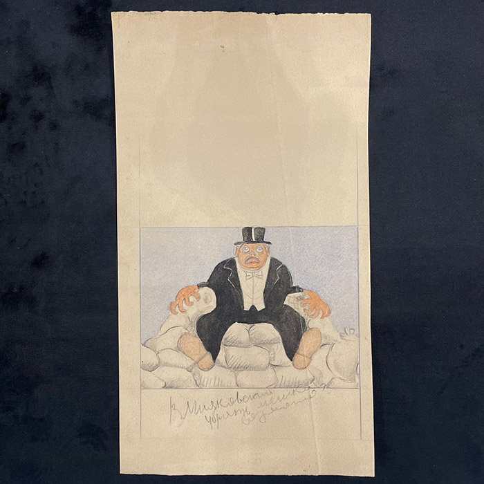 На эскизе изображён персонаж буржуя-капиталиста. Данный образ разрабатывался и принимал разнообразные воплощения в карикатуристике на протяжении всего XX века.