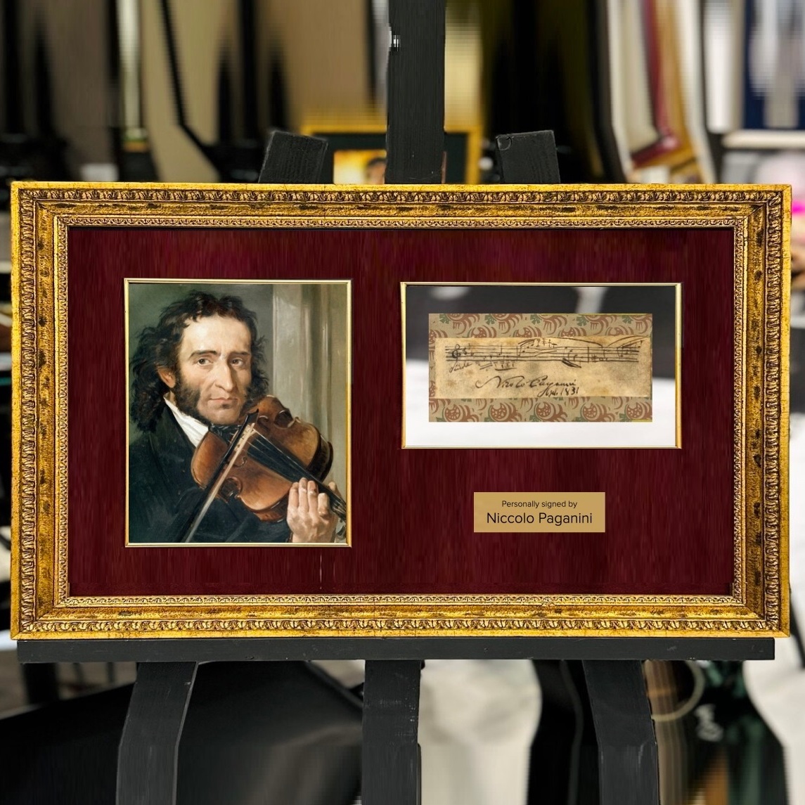 Фрагмент заключен в изысканное обрамление, достойное реликвии. Золотая рама, насыщенный бархат, сверкающий контраст, подчеркивающий значимость каждого росчерка. Рядом — образ самого Паганини, взгляд которого пронзает сквозь века, вызывая трепет. Гениальный маэстро, навсегда связанный с тайной своей музыки, словно смеется над потомками, не способными постичь глубину его дарования.