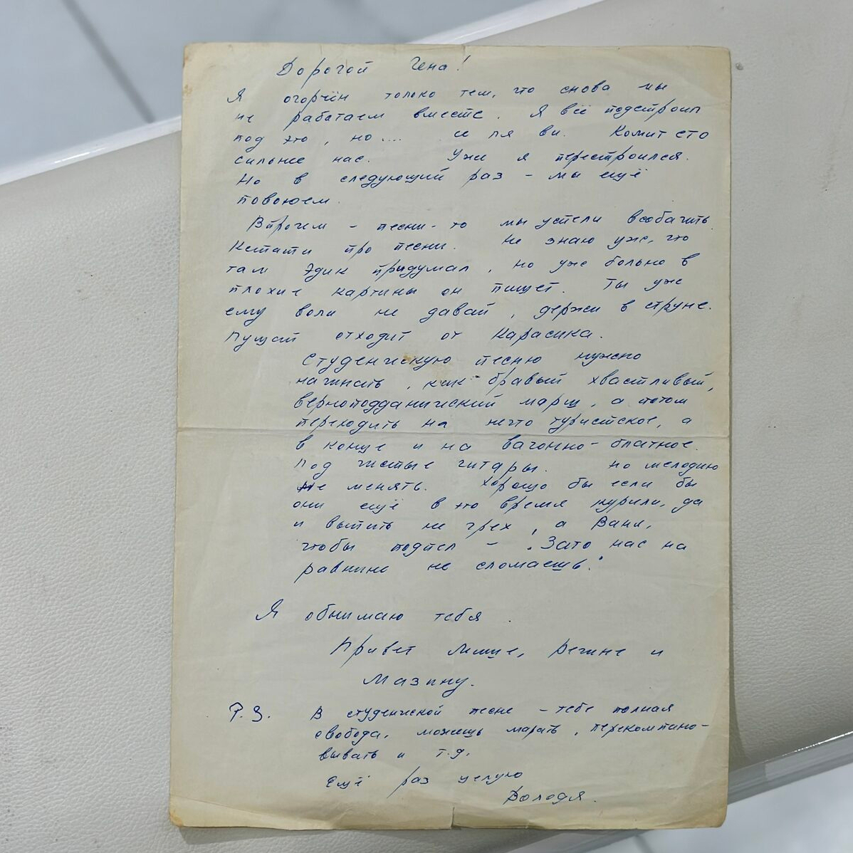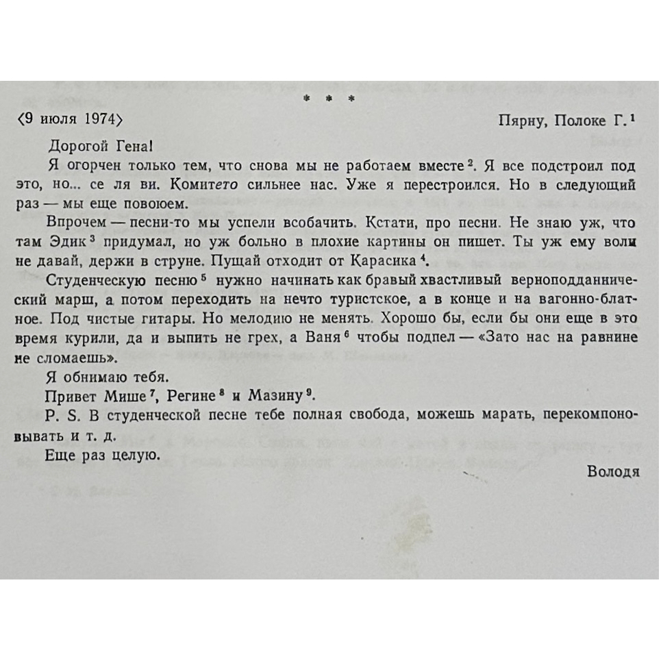 Собственноручное письмо Владимира Высоцкого, адресованное кинорежиссеру Геннадию Полоке. М., 9 июля 1974 г.
