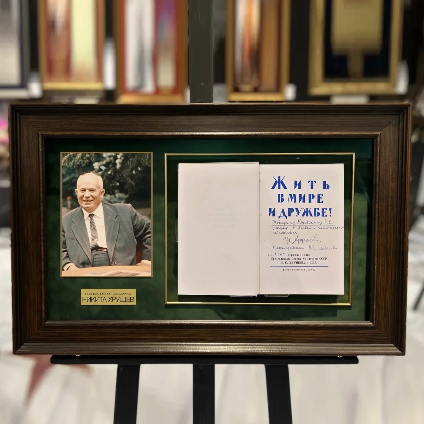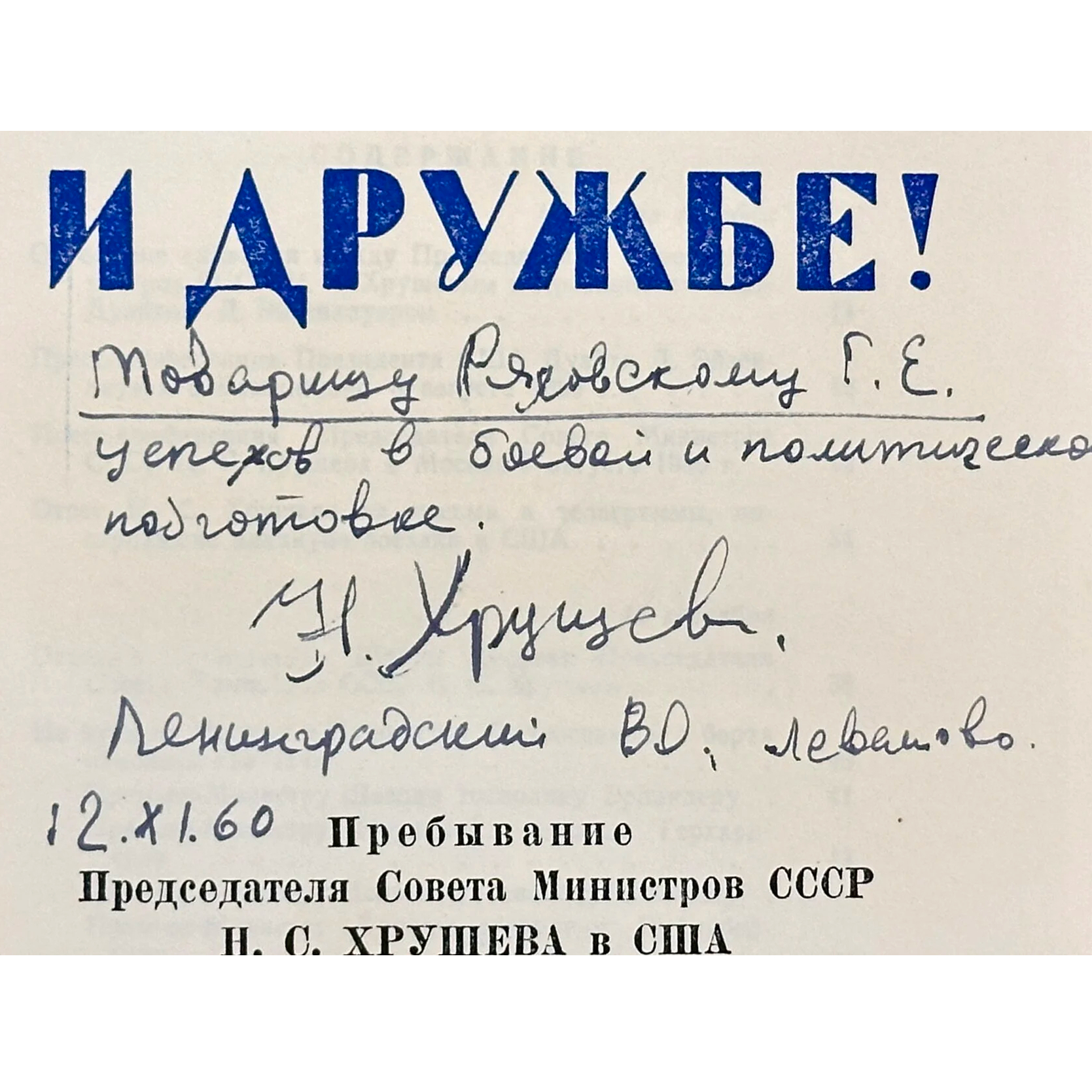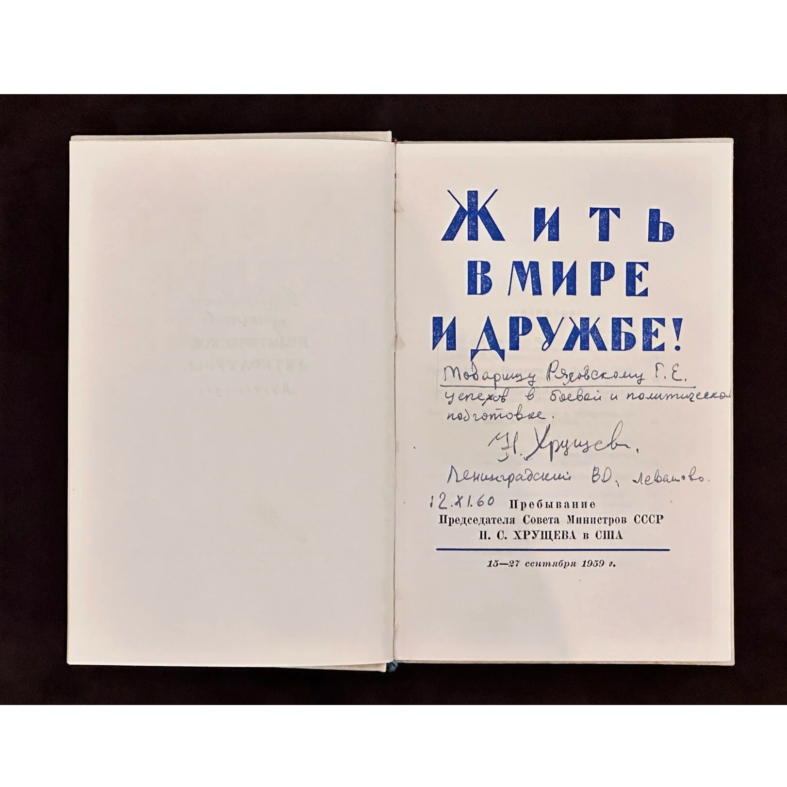Книга «Жить в мире и дружбе» с рукописным обращением и автографом руководителя СССР Никиты Хрущёва