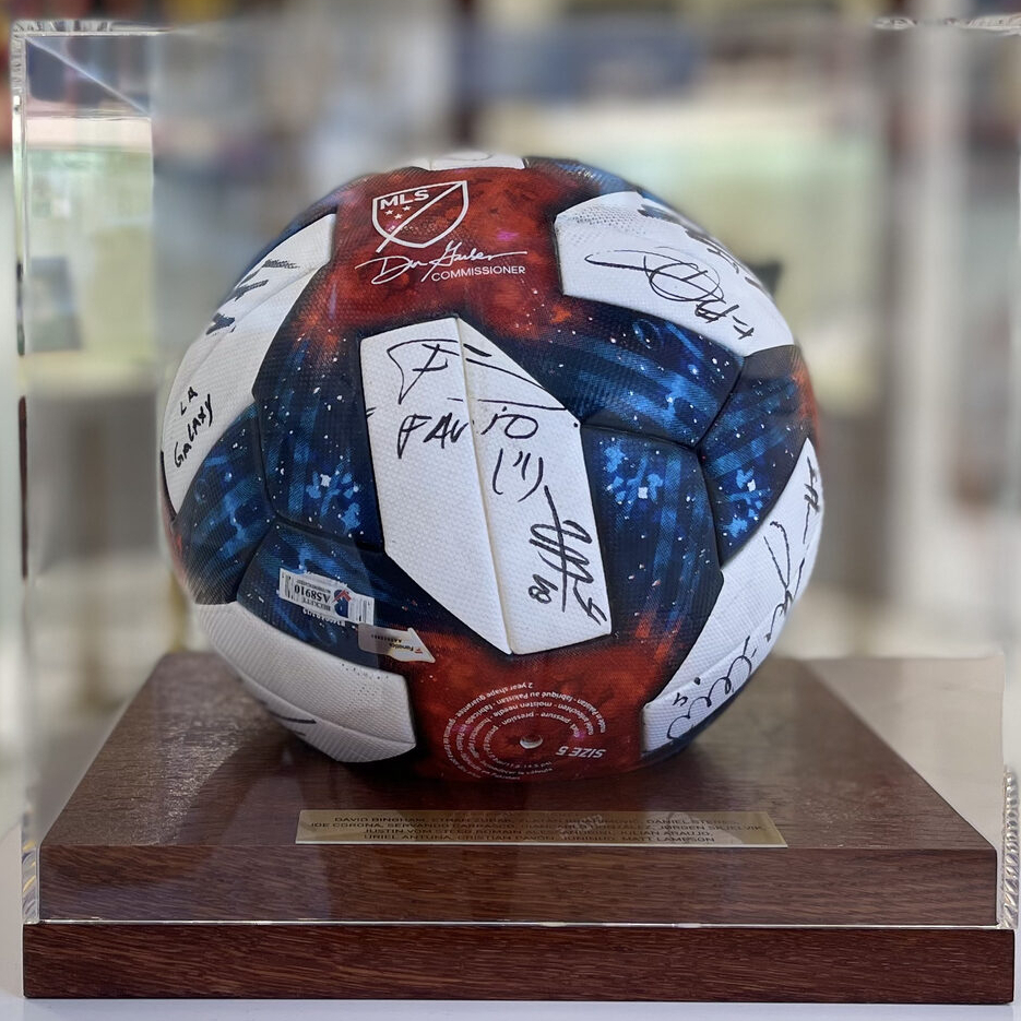 Футбольный мяч с автографами Златана Ибрагимовича, Дэвида Бингема, Итана Зубака, Дэниела Стереса, Джо Корона и других, дерево