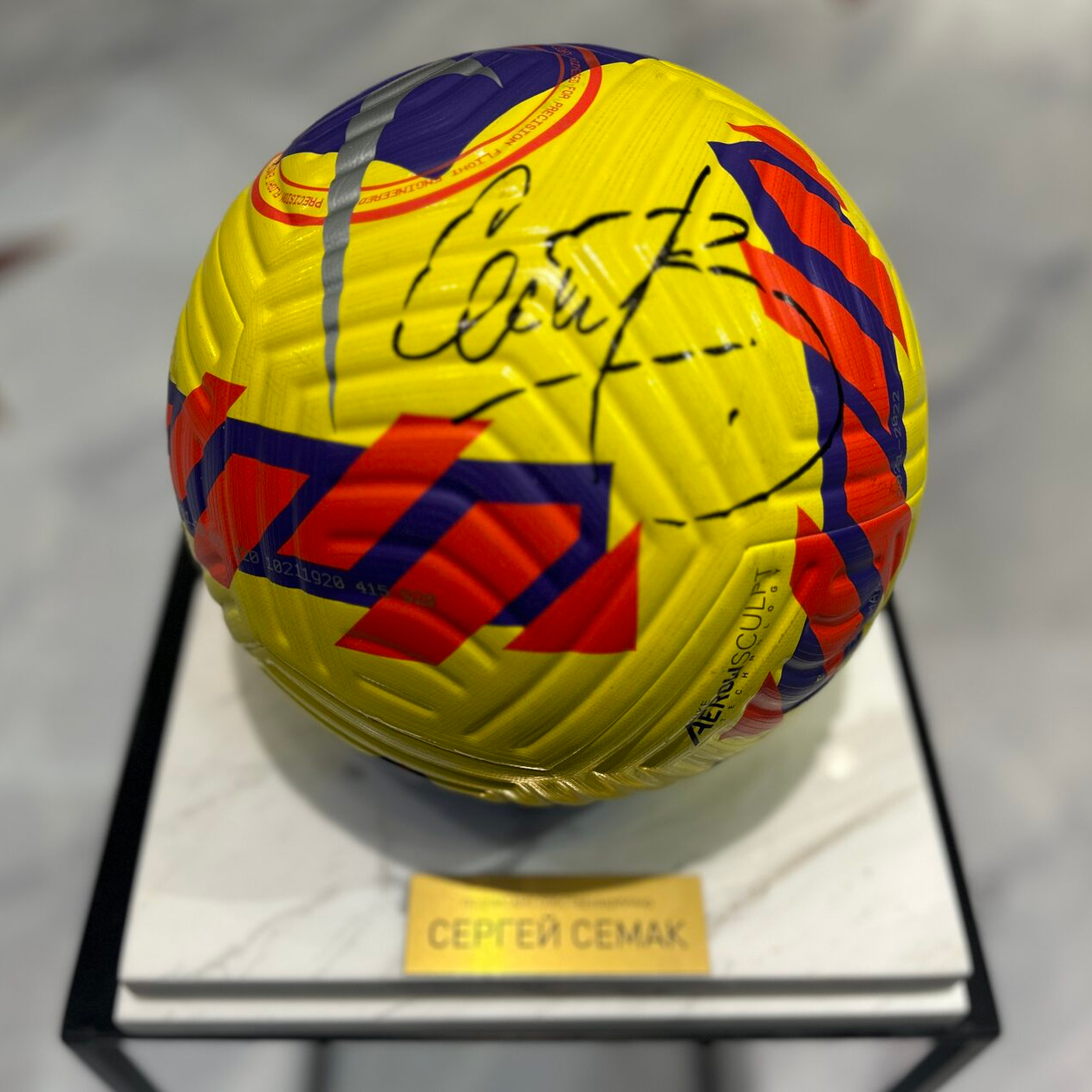 Футбольный мяч с автографом тренера клуба «Зенит» Сергея Семака, мрамор белый