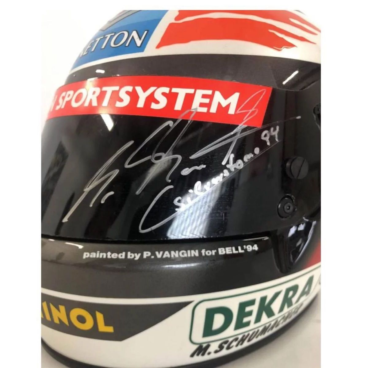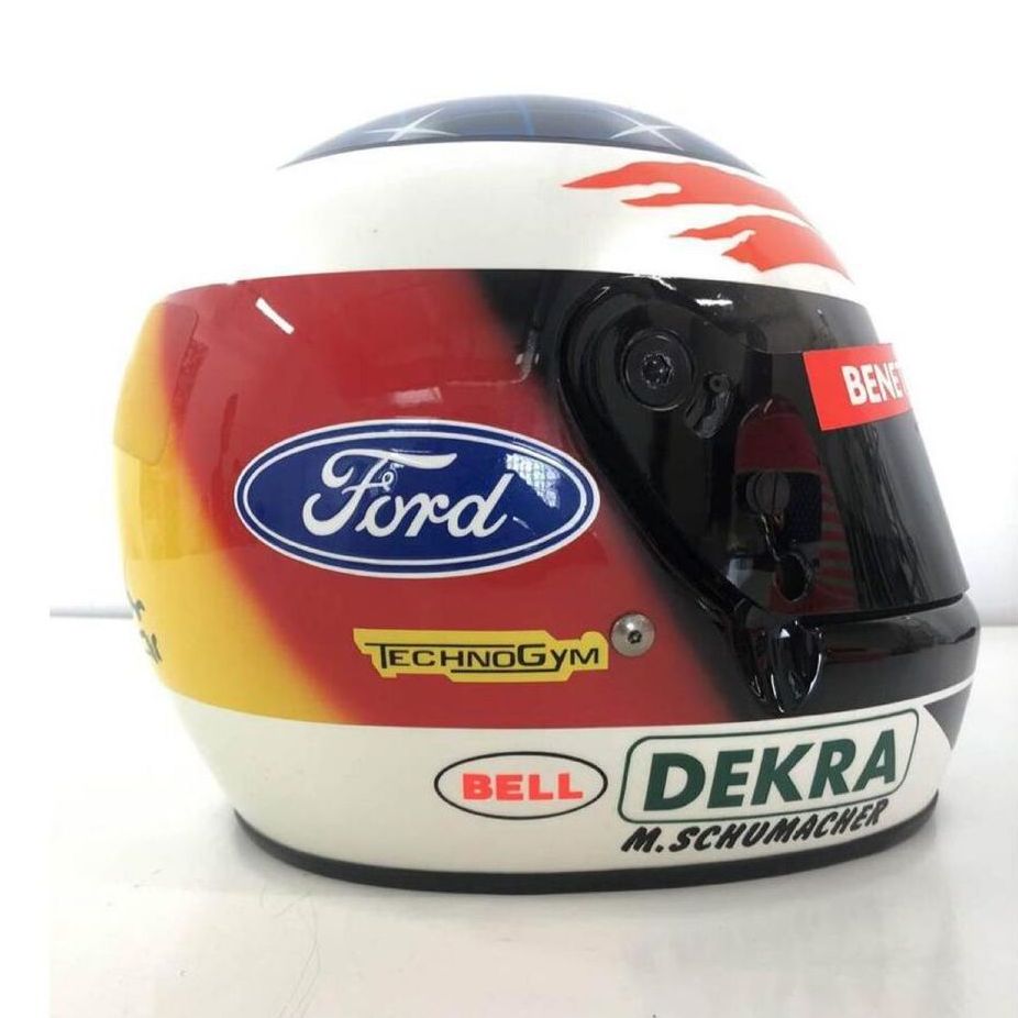 Этот шлем — артефакт эпохи, когда Шумахер шел к своему первому чемпионскому титулу. В 1994 году, управляя Benetton B194 с мотором Ford Zetec-R, он вырвал победу у Деймона Хилла, опередив его всего на одно очко. Каждая гонка того сезона была наполнена драмой и напряжением, но именно на Гран-при Великобритании в Сильверстоуне Шумахер продемонстрировал свою непоколебимость. Среди зрителей, наблюдавших за гонкой, была сама принцесса Диана с юными принцами — символ эпохи и напоминание о том, насколько Формула-1 была не просто спортом, а настоящим спектаклем власти, риска и гламура.