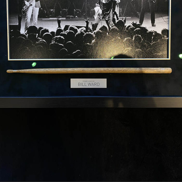 Эта реликвия — не просто инструмент, это символ чистой энергии, бушующей силы, которая создала целую эпоху. Сегодня она заключена в элегантную раму, дополненную черно-белым снимком, на котором запечатлен сам момент триумфа. Внизу, на металлической табличке, имя Билла Уорда — как подпись под эпохальным произведением, как печать подлинности этой истории. Такой экспонат не просто украшает коллекцию — он превращает пространство в точку пересечения прошлого и настоящего, в место, где великая музыка звучит даже в тишине.