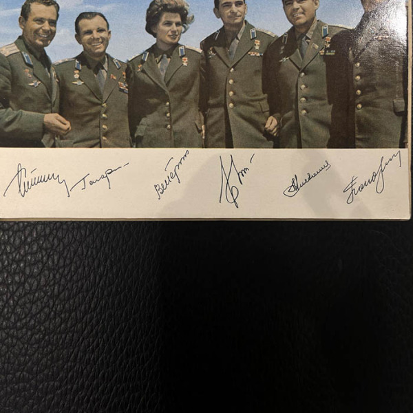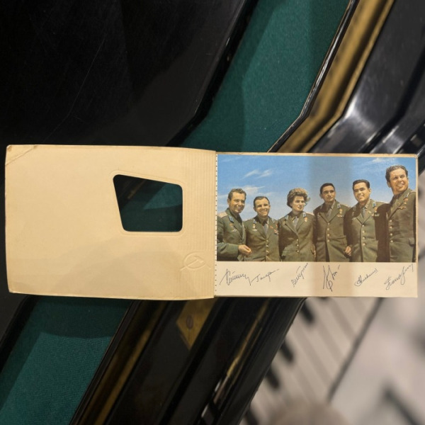 Под вашими пальцами – открытки, на которых оставили свои подписи Юрий Гагарин, Герман Титов, Андриян Николаев, Павел Попович, Валерий Быковский и Валентина Терешкова. Легендарные первопроходцы, каждый из которых внес неоценимый вклад в историю мировой космонавтики. Их автографы – это не просто росчерк пера, это отражение эпохи, когда мужество, отвага и мечта о покорении звёздного неба двигали вперед целую страну.