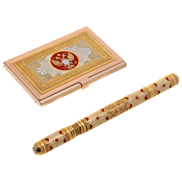 Визитница "Герб РФ" с ручкойВизитница "Герб РФ" с ручкойМногоступенчатый цикл нанесения художественной гравюры: травление, гравирование, ручная подрезка, никелирование, серебрение, золочение, чернение, лакирование. Покрытия позволяют получить практически не подверженные влиянию времени высокохудожественные изделия. Данное изделие укомплектовано подарочной коробкой. Так же данное изделие можно заказать по Вашим эскизам, с дарственной надписью. Возможны различные варианты исполнения рисунка, нанесение фирменной символики.