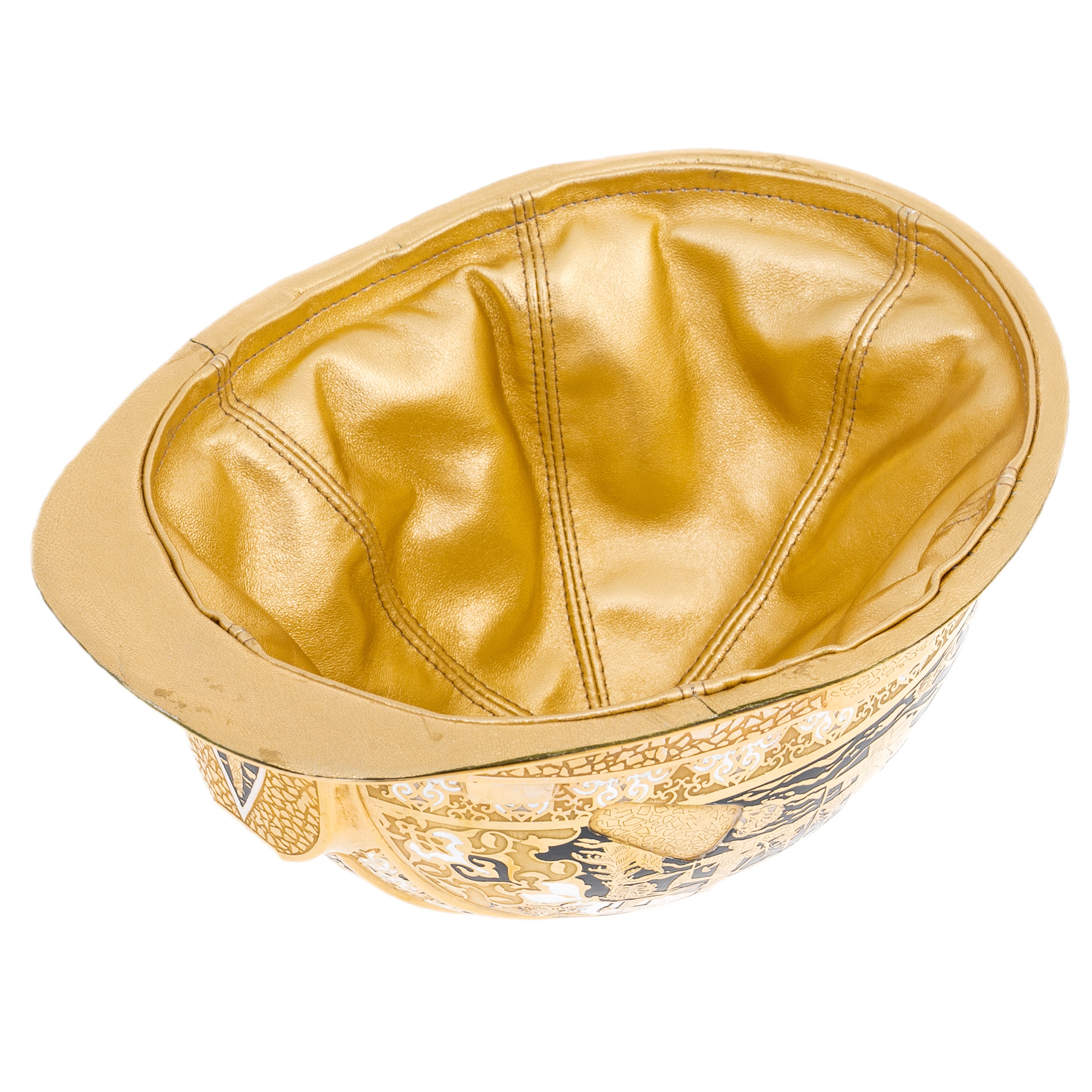 Мастерство исполнения обусловлено техникой художественной гравюры по металлу, по праву считающейся визитной карточкой Златоуста. Узор наносится вручную, с последующим травлением, чернением и золочением — весь процесс требует ювелирной точности и многолетнего опыта. В каждом элементе ощущается та самая школа, где оружейное искусство перешло в искусство мемориального подарка. Благодаря тонкой гравировке и декоративным вставкам каска воспринимается не как утилитарный предмет, а как арт-объект с весомой концептуальной нагрузкой.