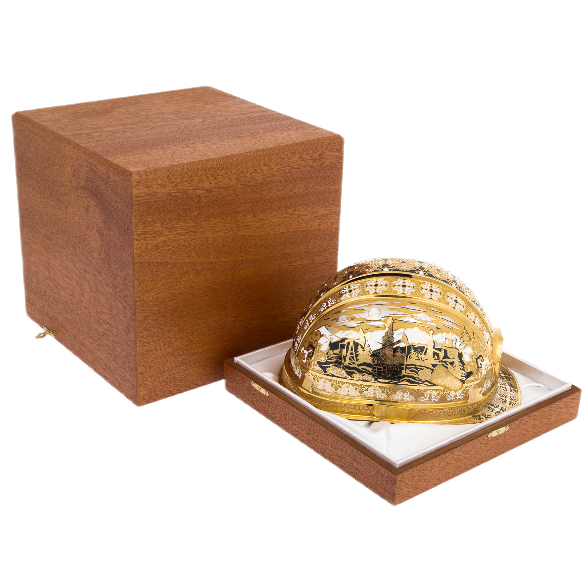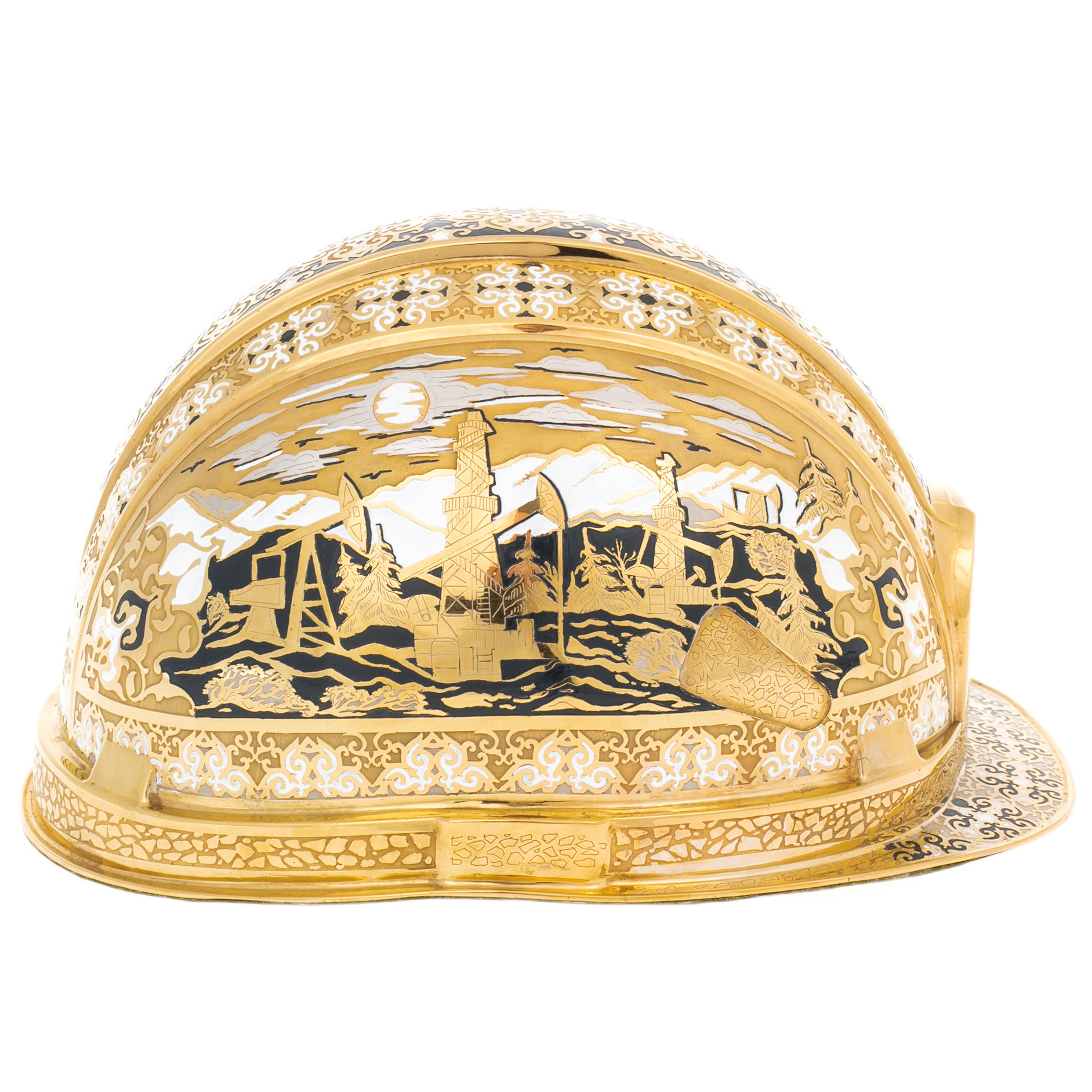 Сувенирная каска из Златоуста — это предмет, в котором соединены мощь индустриальной эпохи и высочайшее ювелирное искусство. Основанная на образе рабочей каски, она превращена в символ уважения к созидательному труду и стратегическому ресурсу — нефти. Латунь, никель, гравировка и гальваническое золочение формируют выразительную композицию, насыщенную знаками нефтяной отрасли: буровые установки, трубы, вышки и капля нефти как концентрат силы, добываемой из недр. Все элементы композиции проработаны с филигранной точностью, объемные рельефы сочетаются с тончайшим орнаментом, а контраст черного и золотого подчеркивает значимость выбранной темы.
