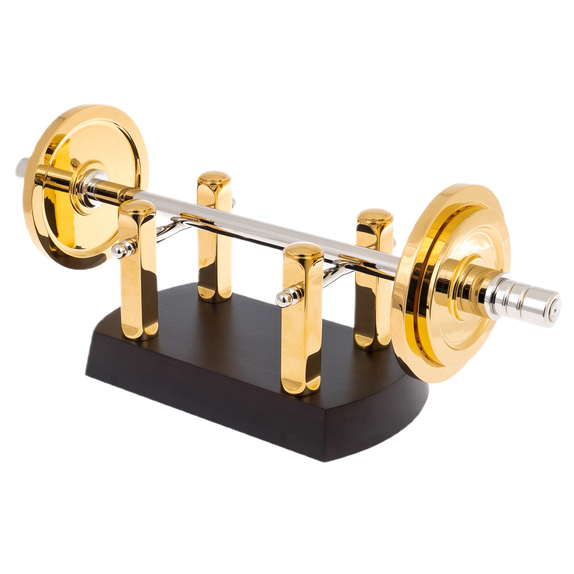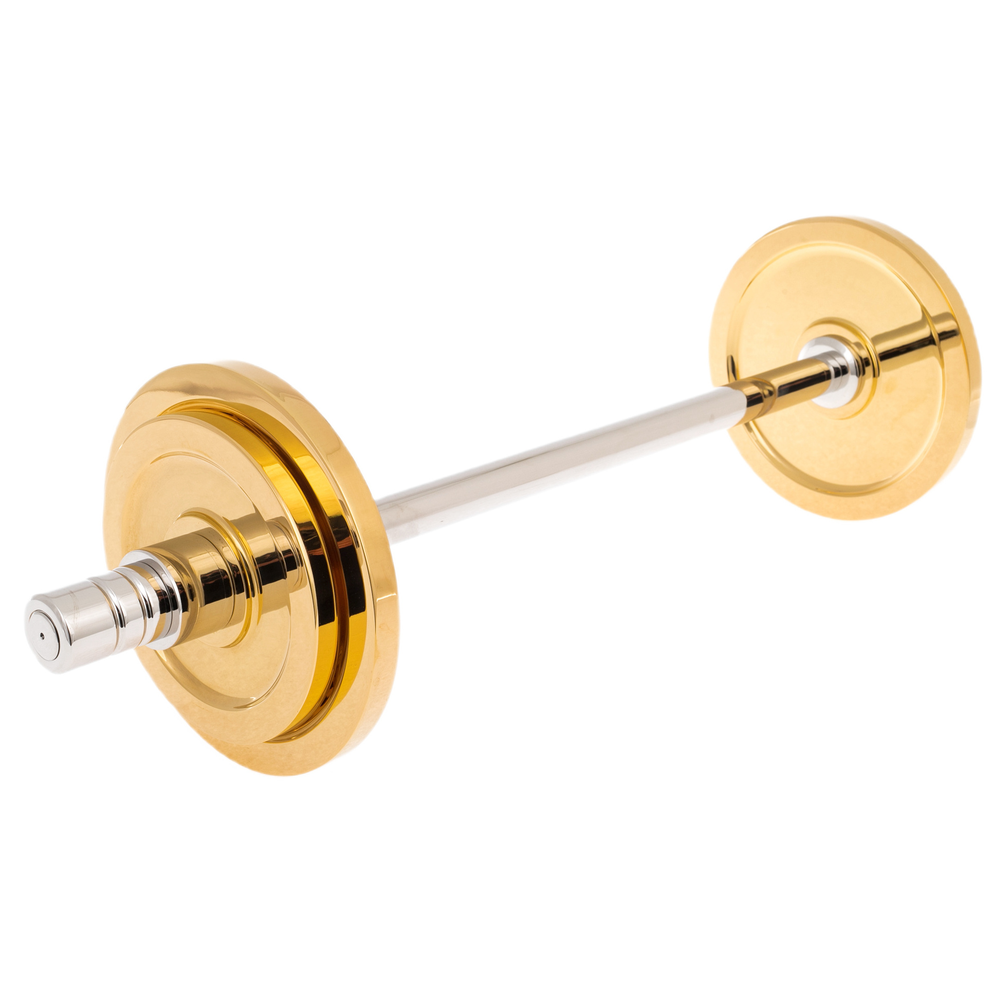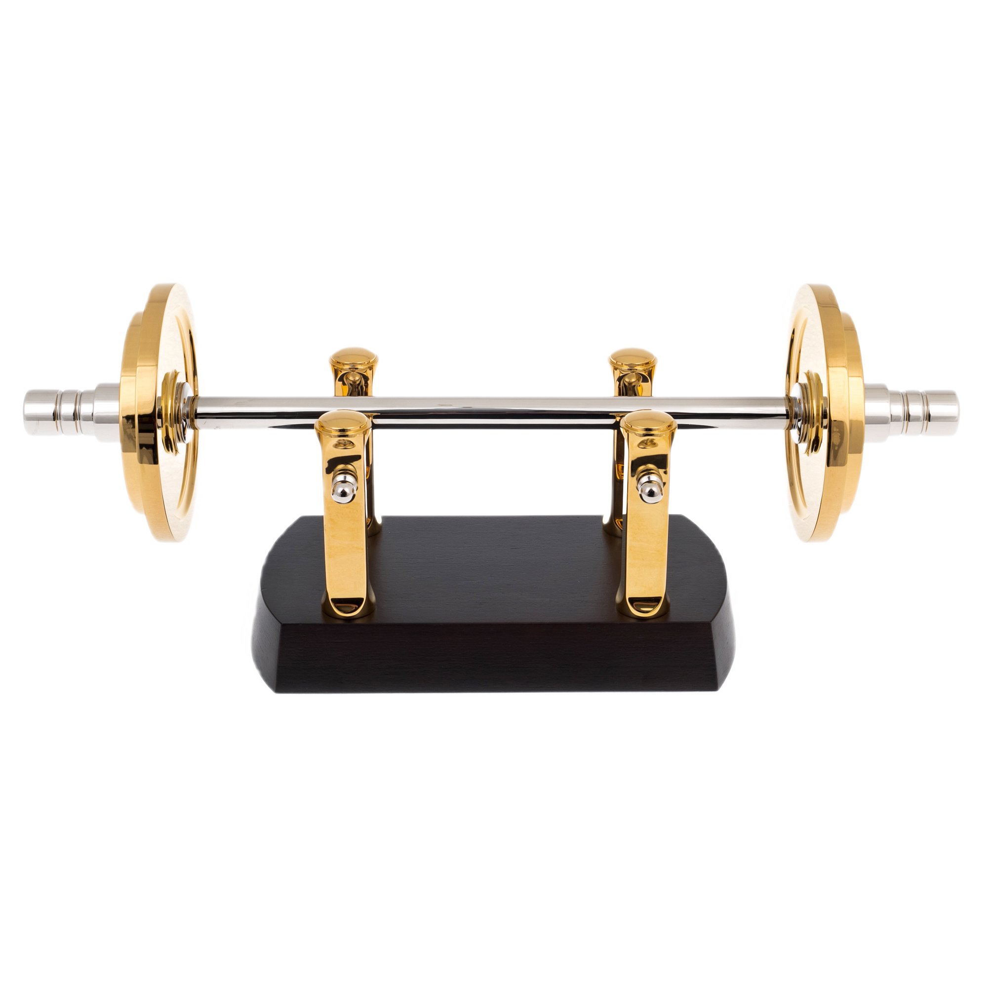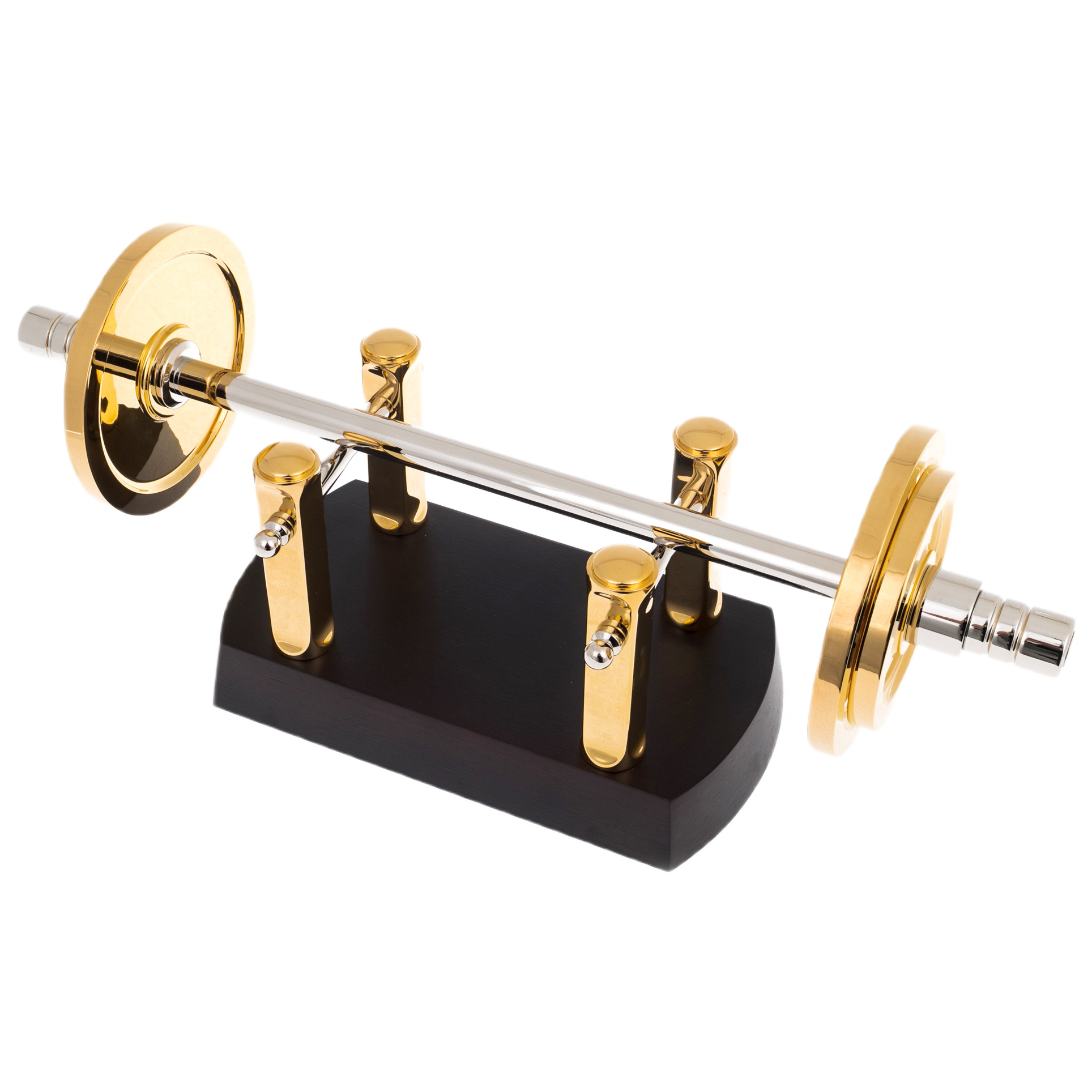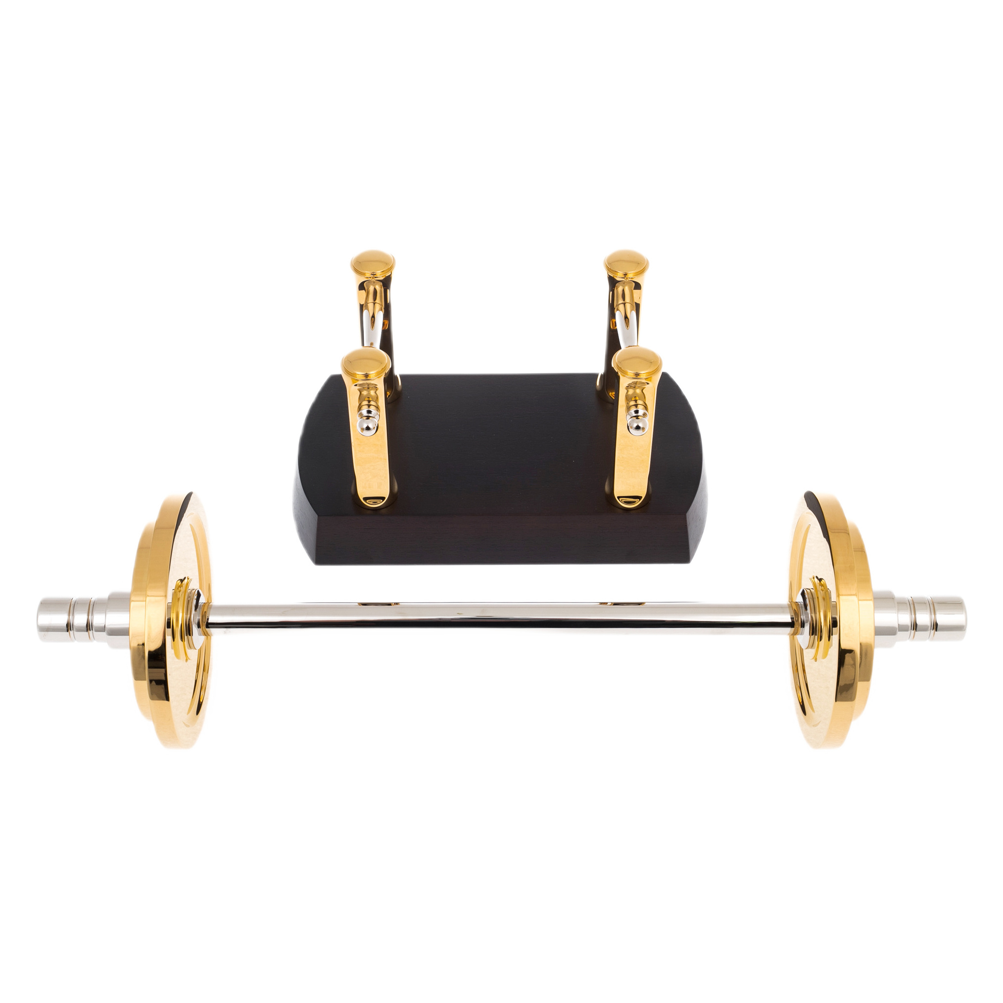 Металлические детали изготовлены с применением никелирования и золочения, создающих контраст светлой стали и тёплого сияния благородного металла. Каждая деталь проработана с филигранной точностью: от гладких дисков до фиксирующих элементов, отражающих эстетику настоящего спортивного снаряда. Сочетание строгих форм и блеска золота превращает утилитарный образ силы в изысканный арт-объект.