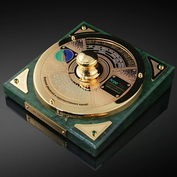 Корпоративный вечный календарь на нефрите, ЗлатоустКорпоративный вечный календарь на нефрите, ЗлатоустВечный календарь от златоустовских мастеров - эксклюзивный сувенир ручной работы, покрытый золотом 999 пробы. Великолепия ему придаёт уникальная многоступенчатая гравировка по металлу и основание из натурального нефрита с замысловатым природным рисунком.