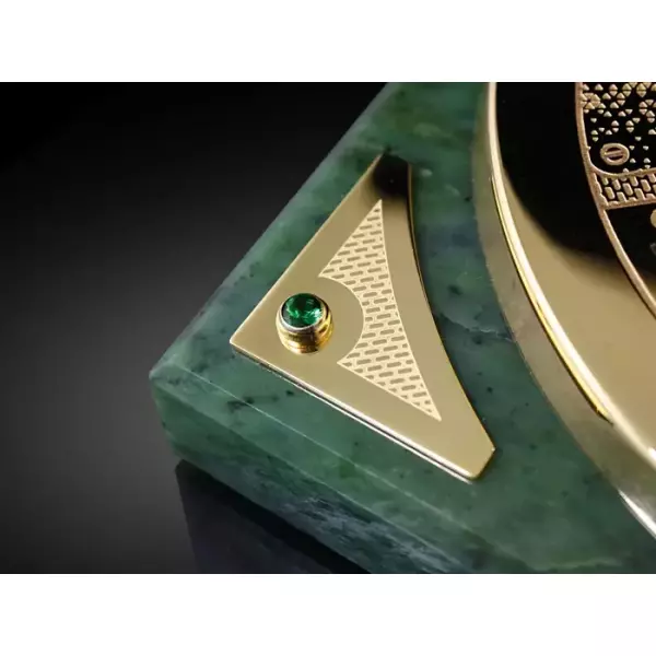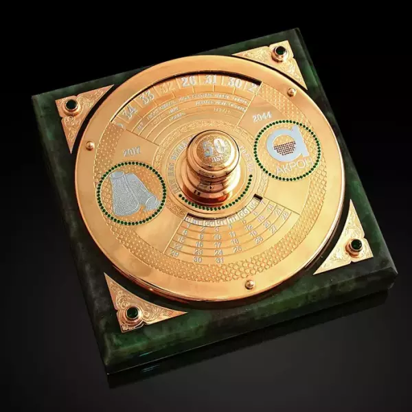 Умельцы из Златоуста знают толк в обработке камня. Из сверхтвёрдого, монолитного куска нефрита они выточили постамент идеальной формы, отшлифовали и отполировали его до блеска. Сам календарь декорирован драгоценной золотой вуалью. Изображения солнца, луны, растительный орнамент и цифры выполнены в технике сложной гравировки резцом и иглой. После травления рисунок обрёл выразительность за счёт чередования матовых и глянцевых оттенков. Конструкция выглядит как ценный музейный экспонат и по праву станет семейной реликвией.