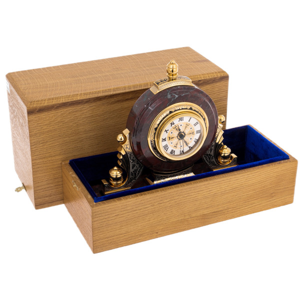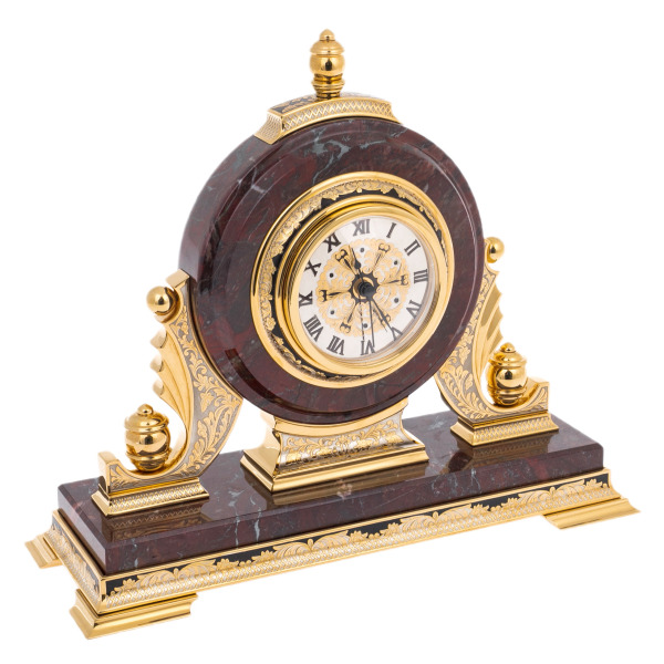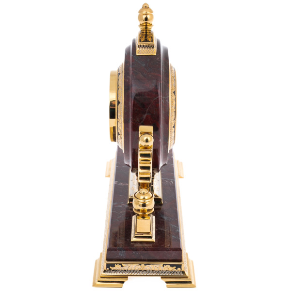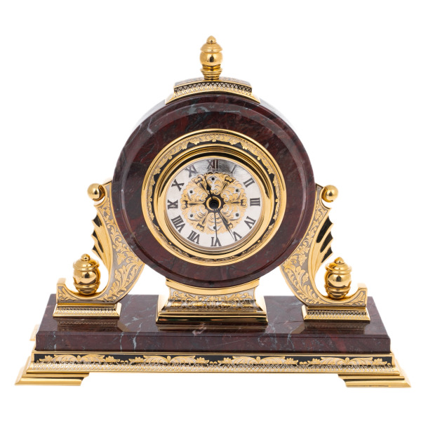 Эти каминные часы из яшмы — истинное произведение искусства, созданное для тех, кто ценит не только точность времени, но и его художественное выражение. Часы выполнены в классическом стиле, где каждая деталь продумана до мелочей. Корпус изготовлен из натуральной яшмы, которая отличается глубоким красно-коричневым оттенком с тонкими вкраплениями чёрного цвета, придающими ему неповторимый характер. Надёжная основа из металла, покрытого золотом, обеспечивает прочность и элегантность внешнего вида.