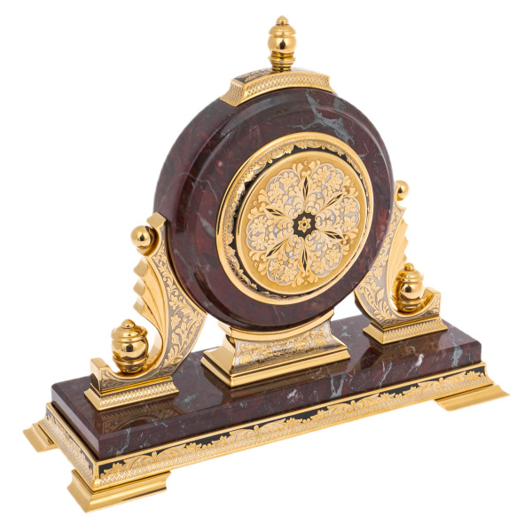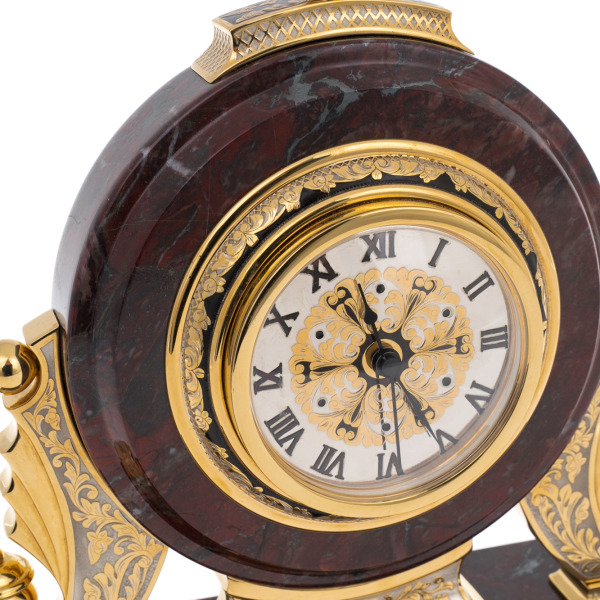 Техника, использованная для отделки декоративных панелей, восходит к традициям златоустовского гравирования. Это искусство, зародившееся на Урале в XIX веке, сочетает в себе сложнейшую ручную гравировку по стали и тончайшее золочение с последующим чернением. Вставки, украшающие колонны и основание часов, выполнены в этой технике: изящные растительные мотивы на чернёном фоне создают эффект драгоценной эмали, а обрамление из золота подчеркивает благородство камня. Каждый элемент, от миниатюрных лебедей на нижнем барельефе до золотых канатов по периметру корпуса, демонстрирует высочайший уровень мастерства.