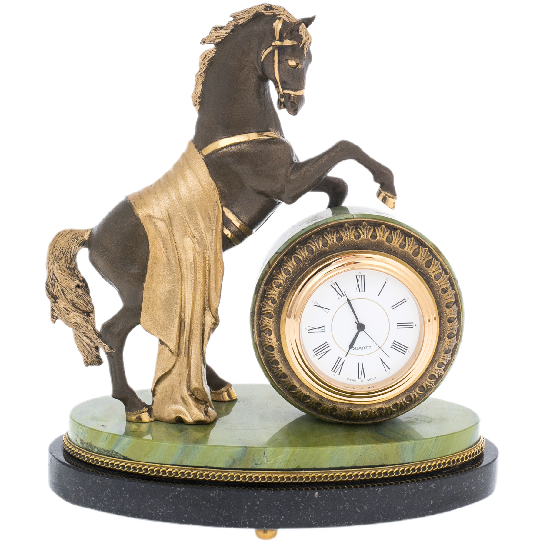 Каминные часы «Конь» — это пластическая метафора внутренней силы, сдержанной грации и природного достоинства. На гладком овальном основании из уральского змеевика, словно на арене или пьедестале, встал на дыбы конь — воплощение благородства и устремлённости вперёд. Его корпус отлит из бронзы, детали подчёркнуты патинированием и позолотой: тяжёлый атлас попоны, блеск гривы, акценты на копытах и сбруе придают фигуре ощущение парадной выправки. Левое переднее копыто с лёгкостью опирается на каменный круг, внутри которого помещён часовой механизм с изящным циферблатом в золочёной оправе — символ контроля над временем.