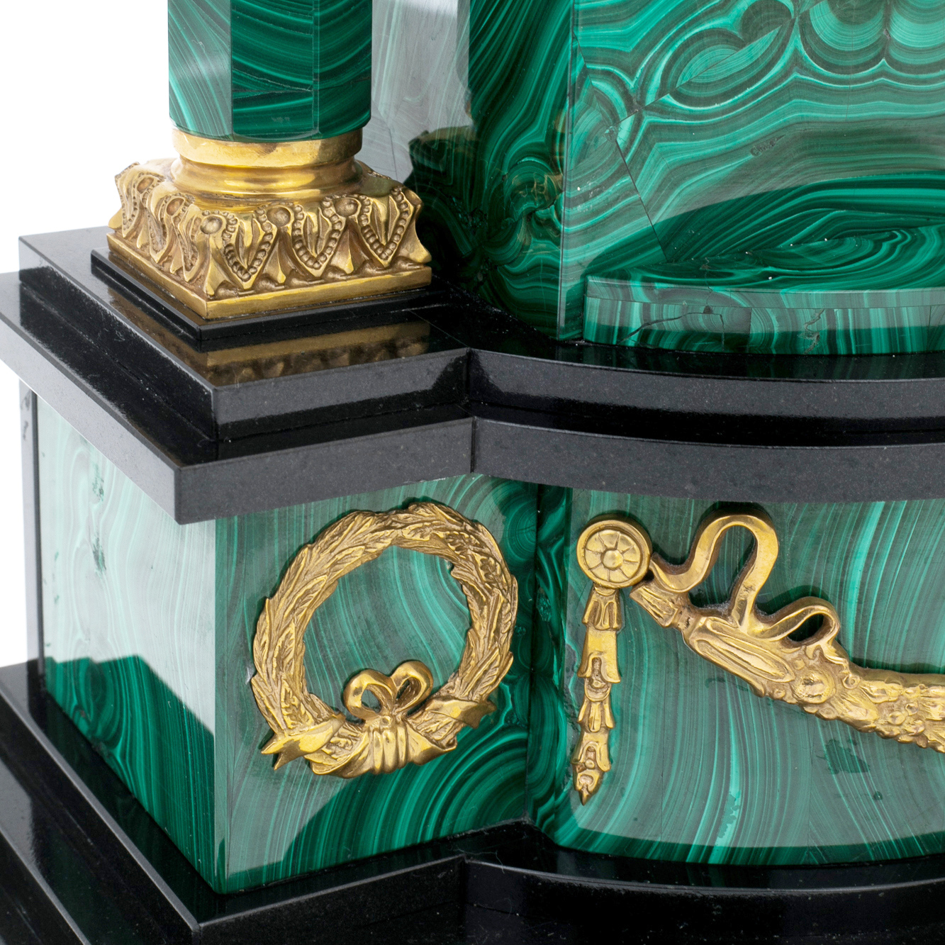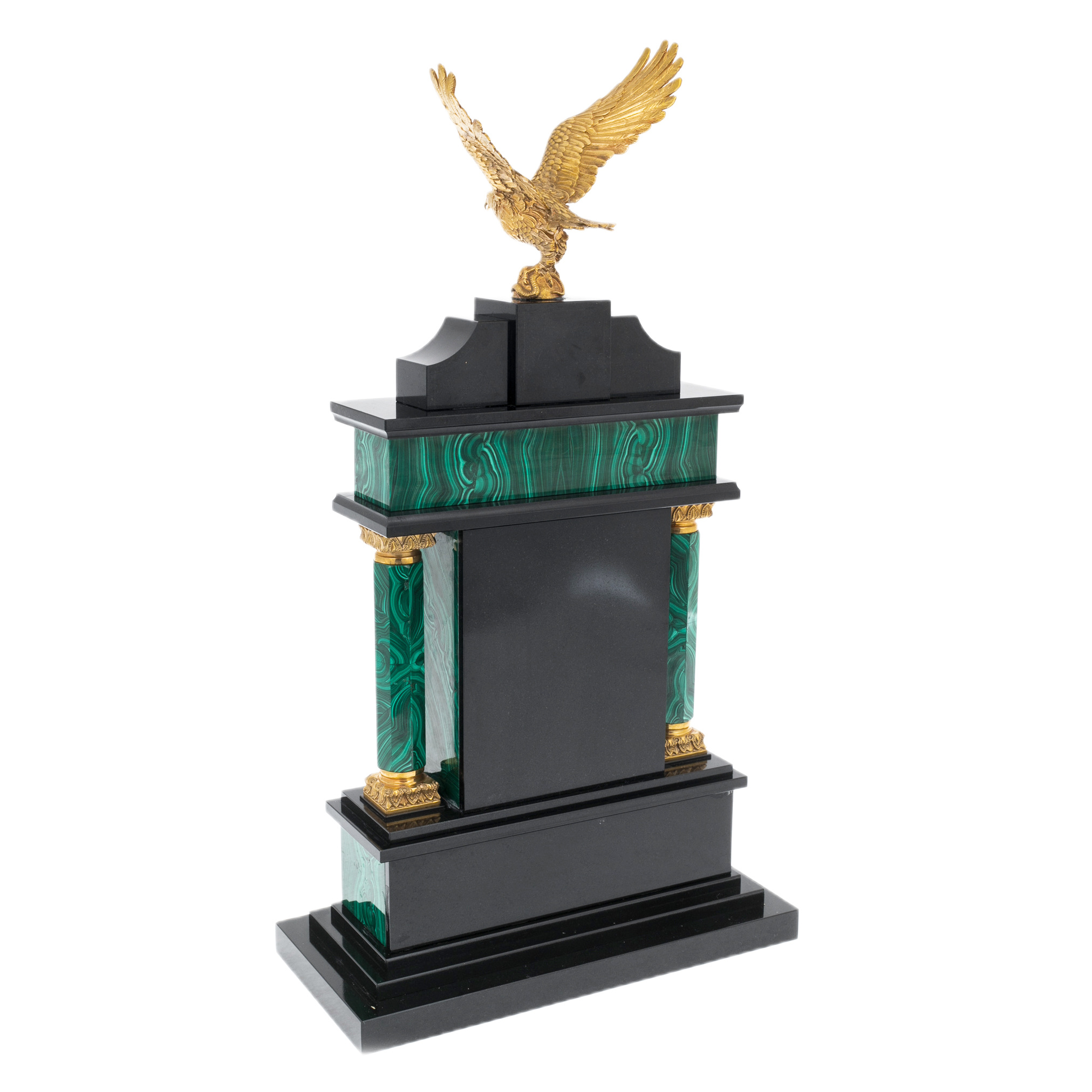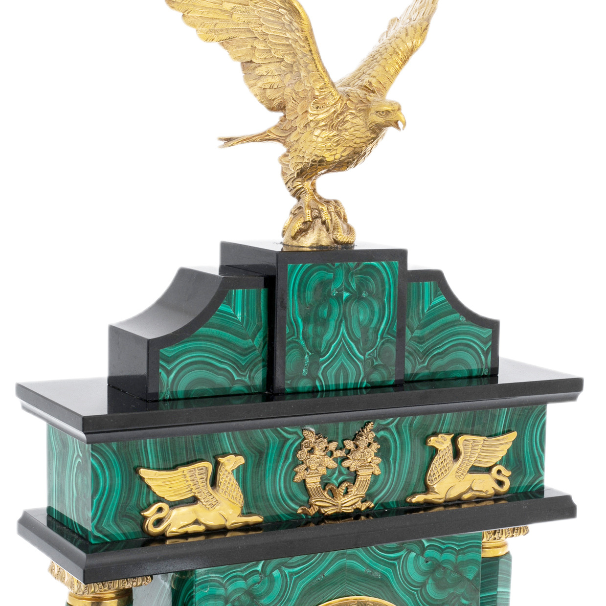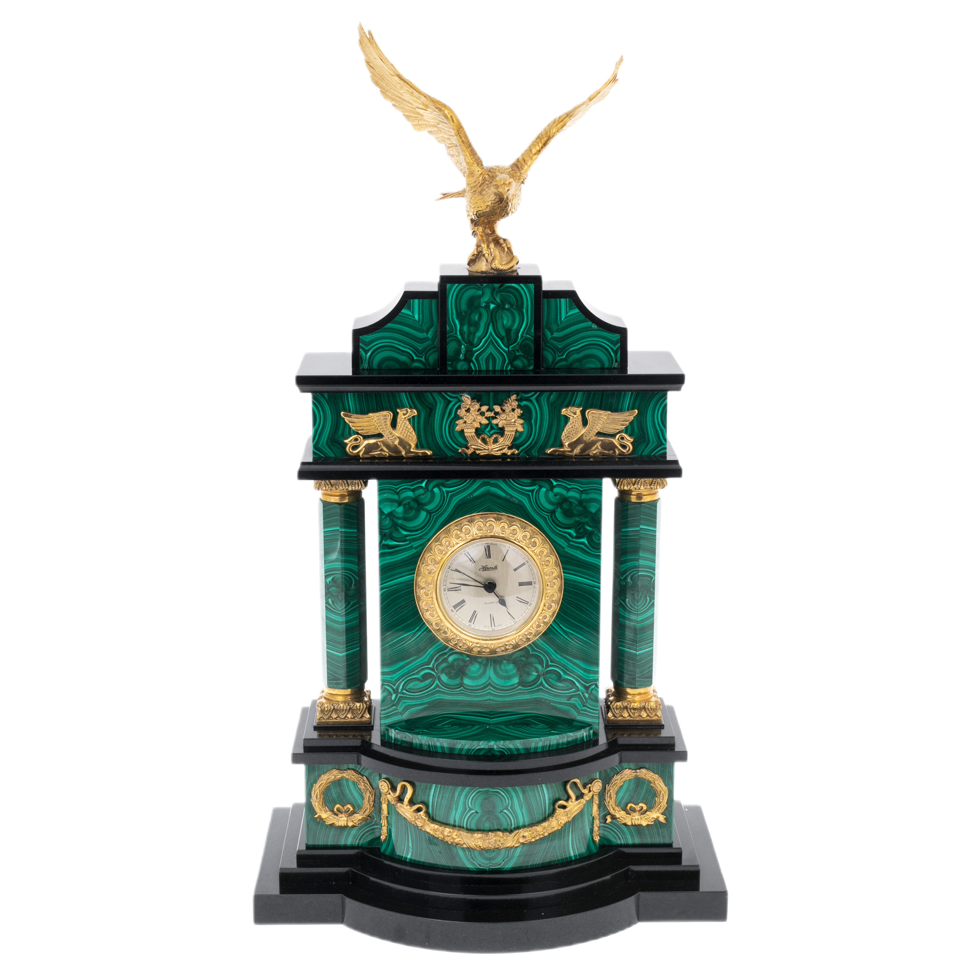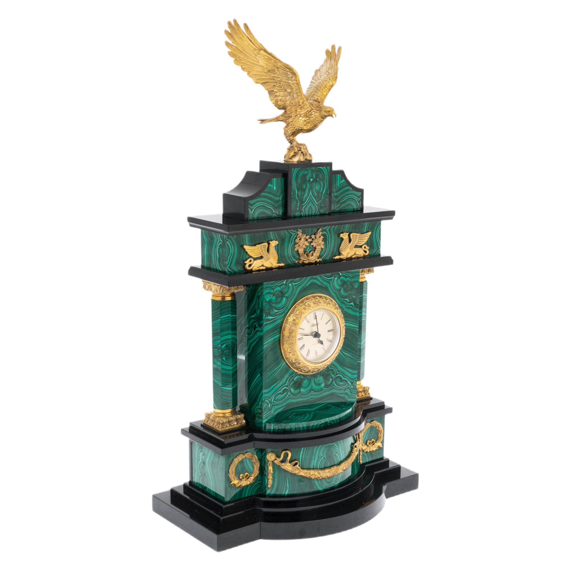 Материалы подобраны с пониманием их символики и эстетики: малахит — камень процветания и силы; позолота — вечное сияние мощи; латунь и никелирование — хранители формы и линий. Подвижный циферблат с римскими цифрами и точными стрелками заключён в металлическую окантовку, контрастируя с природным рисунком камня и подчёркивая искусность исполнения. Каждый изгиб, каждая грань и декоративный элемент — результат ювелирного подхода, где нет случайных деталей, а есть гармония формы, смысла и материала.
