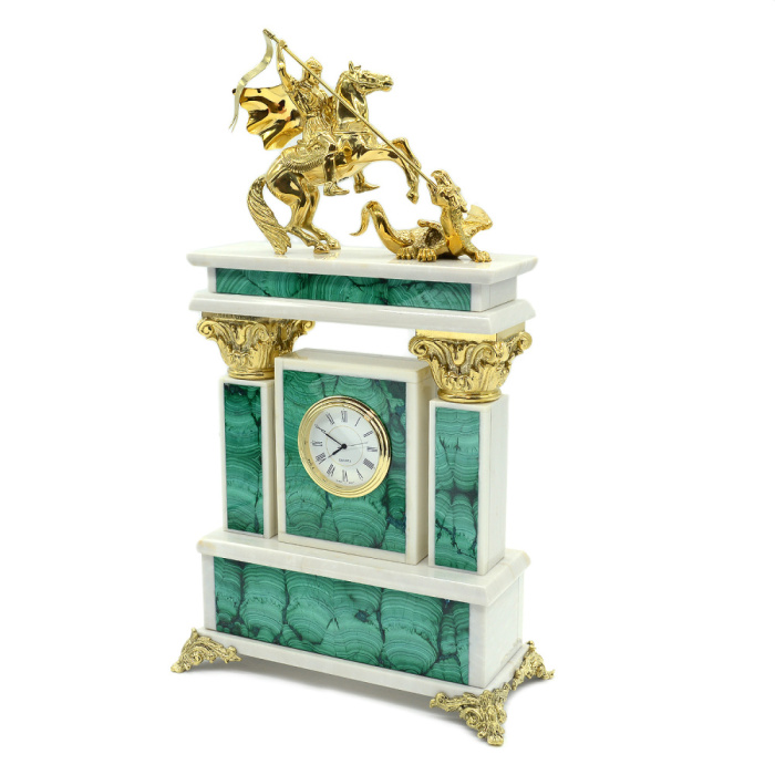 Часы каминные из малахита и мрамора "Георгий Победоносец"
