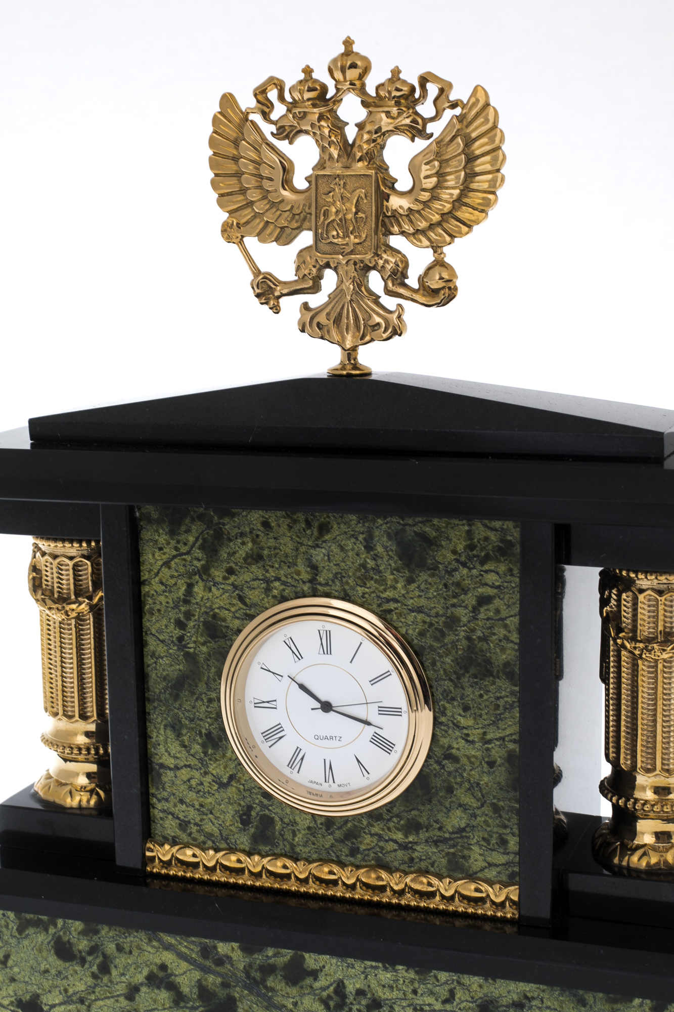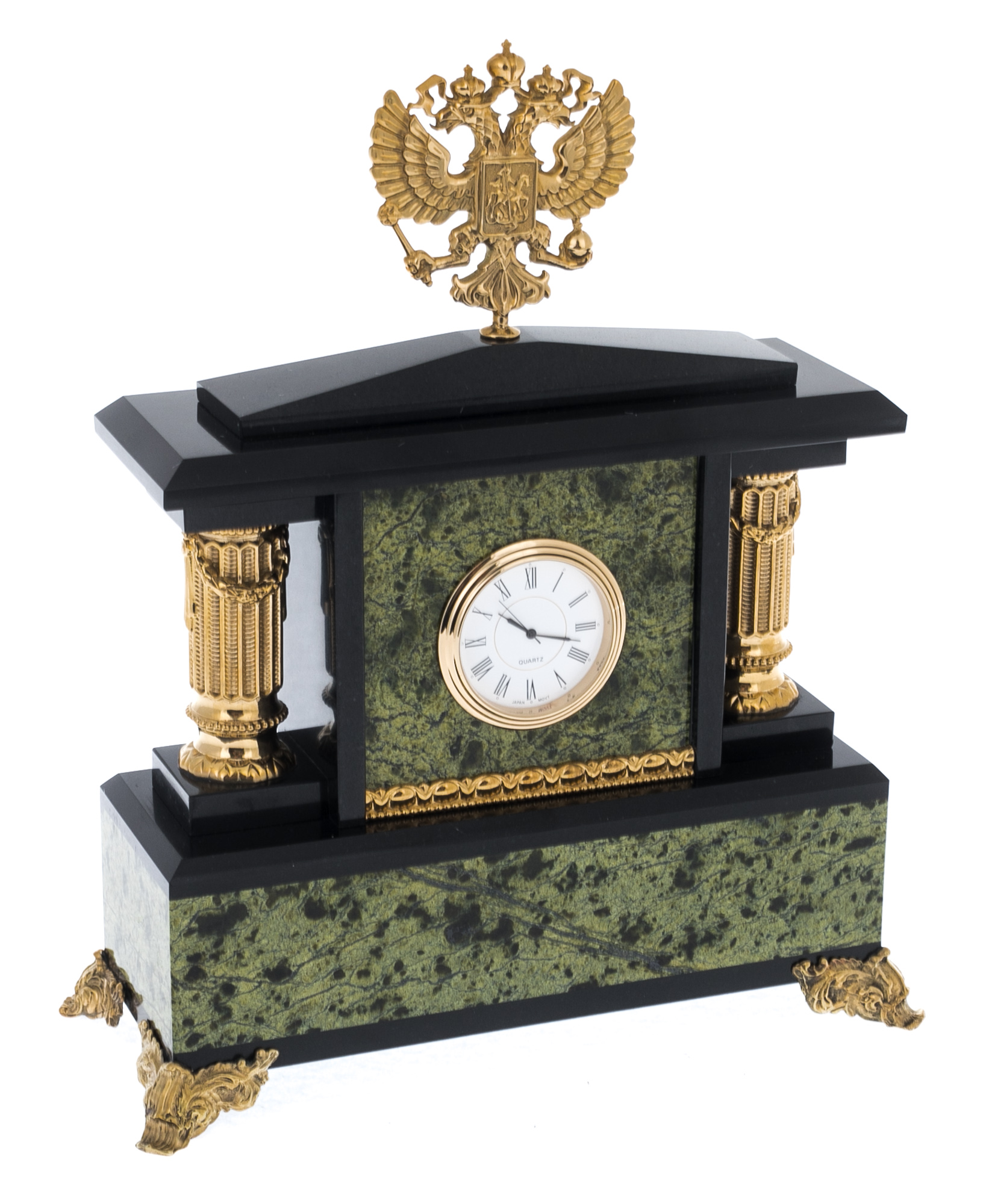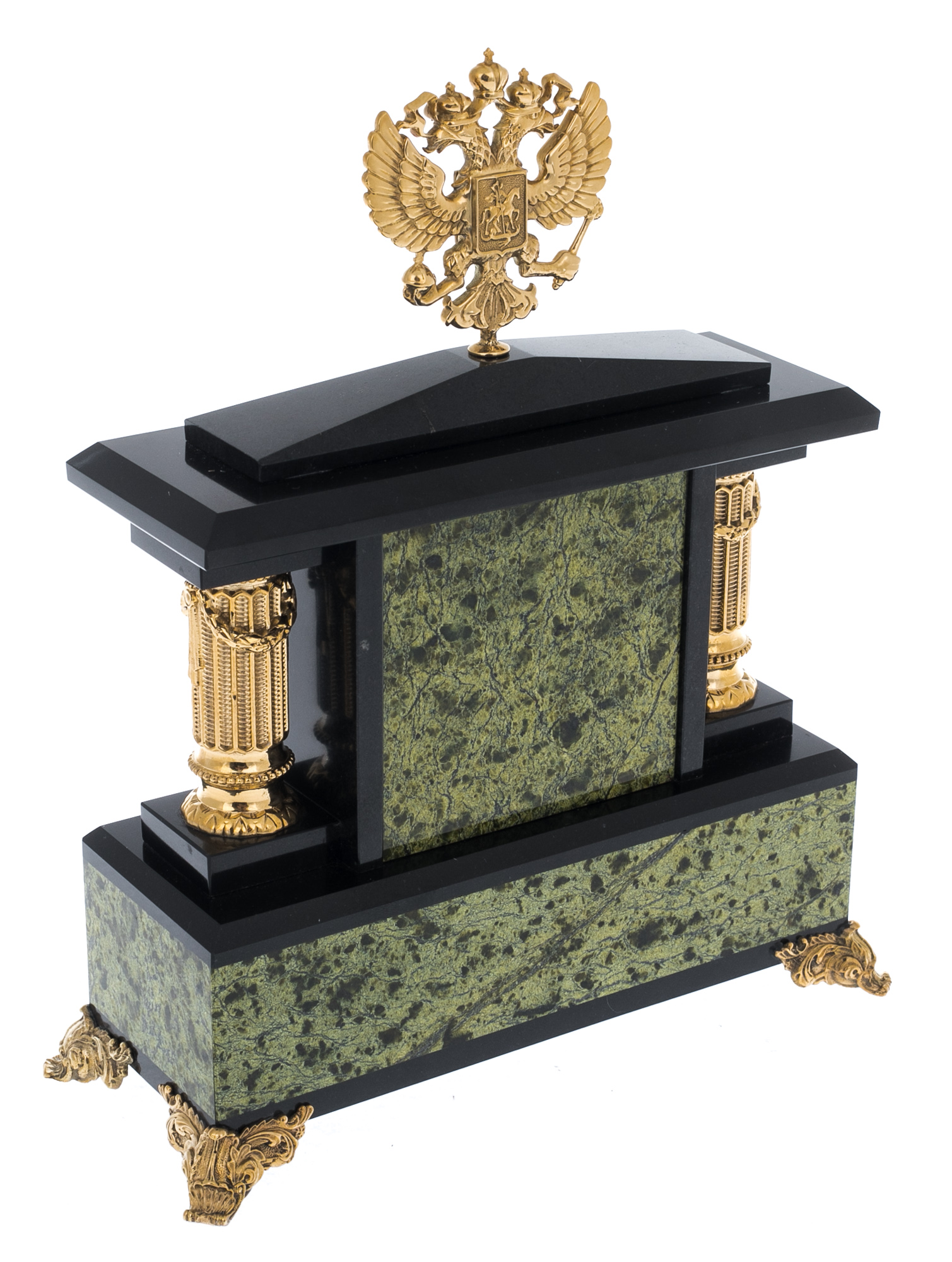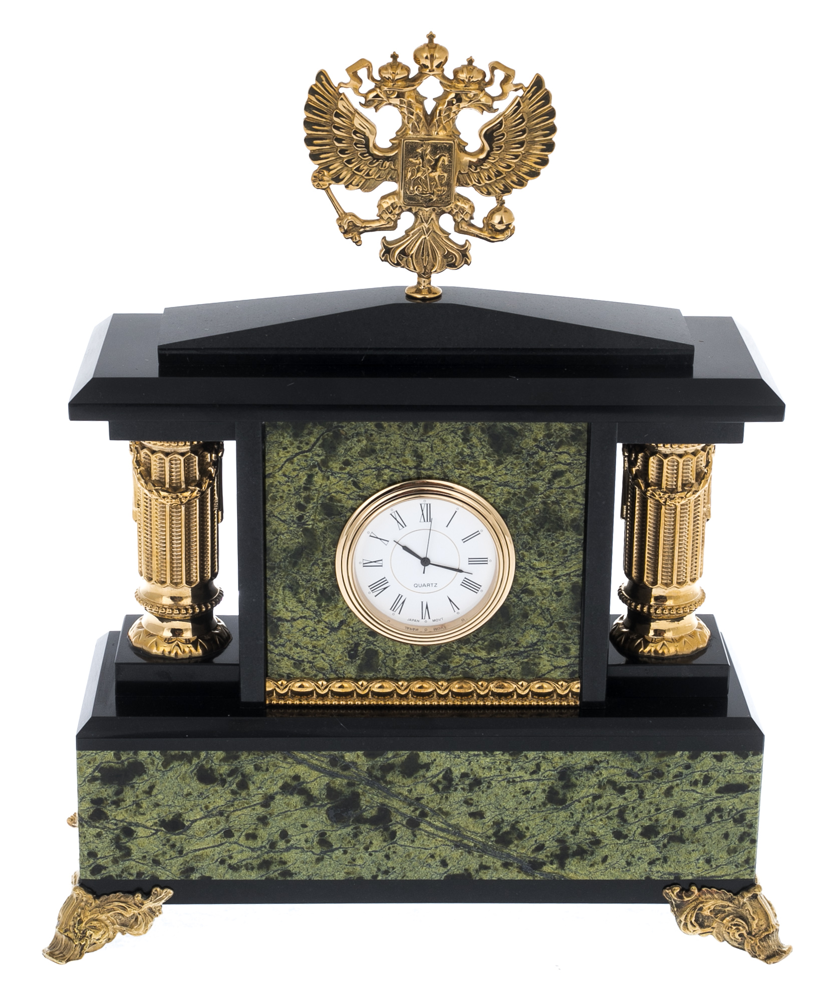 Каминные часы-шкатулка из змеевика "Птицы" ЗлатоустКаминные часы-шкатулка из змеевика "Птицы" ЗлатоустКаминные часы, вырезанные из уральского змеевика и декорированные позолоченными деталями, представляют собой не просто предмет интерьера, а настоящую коллекционную ценность для эстета. На пьедестале, обрамлённом четырьмя колоннами, расположилась композиция из двух экзотических птиц, выточенных из металла с ювелирной тщательностью и инкрустированных натуральными камнями: глубокий черный оникс подчёркивает массивность корпуса одной птицы, а насыщенный зелёный нефрит отсылает к природной цветовой палитре другой. На фронтальной части пьедестала расположены два выдвижных ящика, аккуратно встроенных в конструкцию, и украшенных золочёными накладками с растительным орнаментом. Часы венчает арочный корпус, в который вмонтирован циферблат немецкой марки Hermle с классическими римскими цифрами.