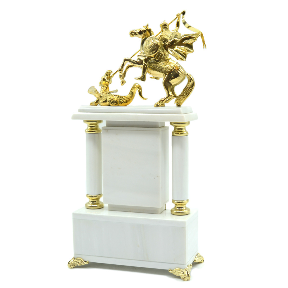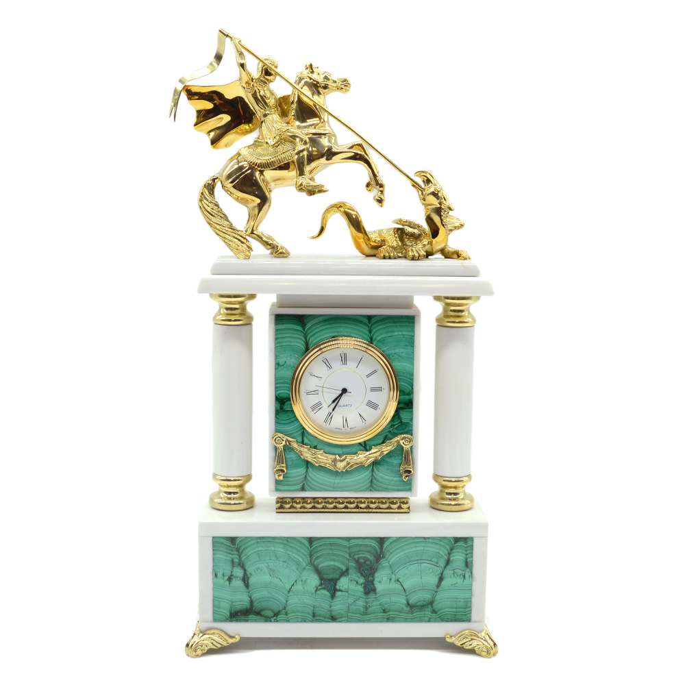 Каминные часы "Георгий Победоносец" малахит, белый мрамор