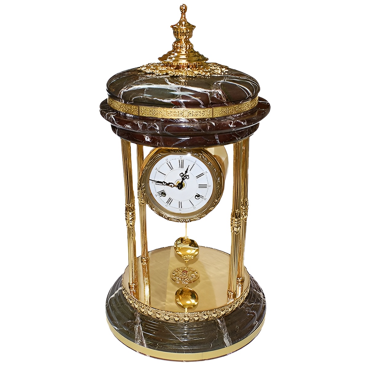 Циферблат с римскими цифрами обрамлён золочёным корпусом с ручной гравировкой. Позолоченные колонны, отлитые из латуни, украшены рельефными капителями и соединены с мраморным основанием тончайшей окантовкой, повторяющей винтажные английские орнаменты. Внутри — маятник с двумя шарообразными гирями, исполняющий роль не только механической, но и визуальной доминанты. Каждая деталь собрана вручную, с филигранной тщательностью, позволяющей рассматривать часы не как прибор, а как скульптурную композицию в жанре applied art.