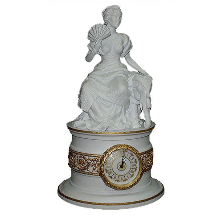 Каминные часы «Азия» — редкий образец фарфоровой пластики, в котором изящество скульптуры сочетается с функциональной утилитарностью. На фоне минималистичной формы корпуса выделяется тончайшая фигура женщины Востока, изображённой в момент благородного спокойствия. Складки одежды ниспадают мягкими волнами, веер в руке добавляет ритма и таинственности, а вторая рука изящно опирается на фигуру слона — древнего символа мудрости, силы и царского достоинства. Скульптура выполнена из матового белого фарфора и отличается ювелирной проработкой деталей, присущей работам лучших мануфактур.