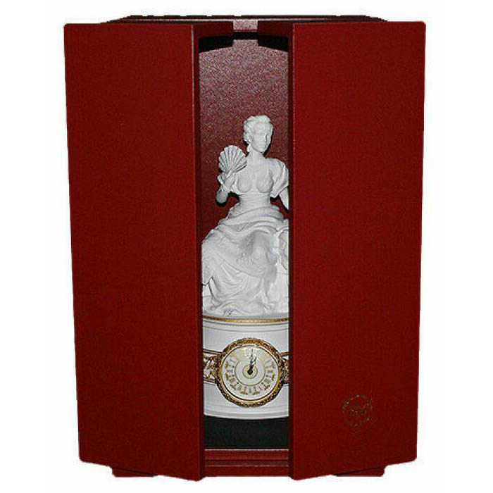 Циферблат встроен в основание и обрамлён венком из рельефной позолоты, подчёркивающей торжественность композиции. Декоративный фриз, охватывающий корпус по окружности, украшен орнаментом, вдохновлённым восточными мотивами. Цветовая палитра выдержана в аристократичном дуэте белого и золота, что позволяет предмету быть выразительным без излишней помпезности. Часы надёжно хранятся в закрытом футляре цвета тёмного вина — элегантная упаковка лишь усиливает впечатление эксклюзивности.