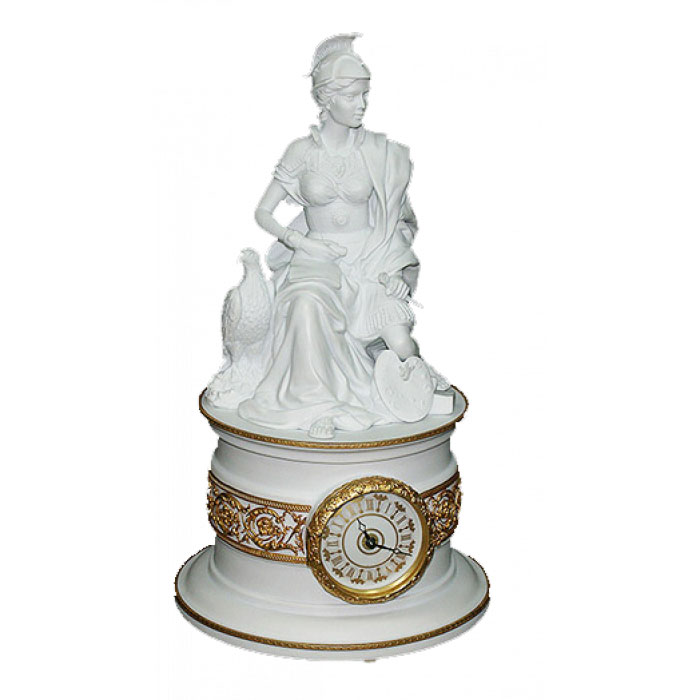 Каминные часы «Европа» — изысканное произведение фарфоровой скульптуры, где античные аллегории обретают форму и силу. На постаменте из белоснежного бисквитного фарфора восседает богиня в классическом облачении, символизирующая Европу как цивилизацию разума, власти и культурного преемства. Её образ строг и гармоничен: на голове — шлем воина, в руках — свиток, а у ног — щит, олицетворение защиты, орёл как символ победы и бдительности, и лавровый венок славы. Каждая деталь скульптуры исполнена с ювелирной точностью и глубоким знанием академической пластики.