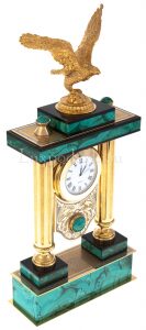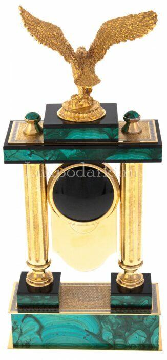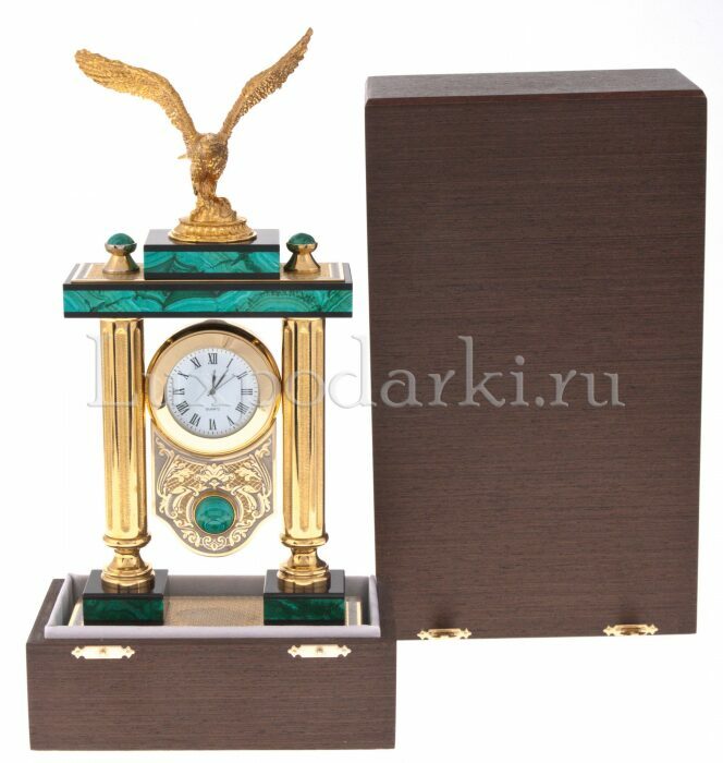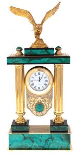 Каминные часы-шкатулка из змеевика "Птицы" ЗлатоустКаминные часы-шкатулка из змеевика "Птицы" ЗлатоустКаминные часы, вырезанные из уральского змеевика и декорированные позолоченными деталями, представляют собой не просто предмет интерьера, а настоящую коллекционную ценность для эстета. На пьедестале, обрамлённом четырьмя колоннами, расположилась композиция из двух экзотических птиц, выточенных из металла с ювелирной тщательностью и инкрустированных натуральными камнями: глубокий черный оникс подчёркивает массивность корпуса одной птицы, а насыщенный зелёный нефрит отсылает к природной цветовой палитре другой. На фронтальной части пьедестала расположены два выдвижных ящика, аккуратно встроенных в конструкцию, и украшенных золочёными накладками с растительным орнаментом. Часы венчает арочный корпус, в который вмонтирован циферблат немецкой марки Hermle с классическими римскими цифрами.