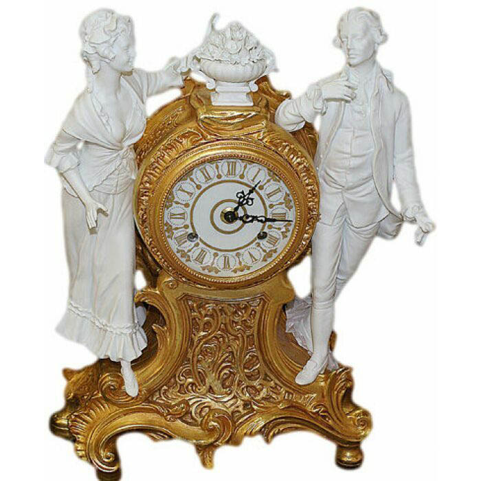 Каминные часы «Дама с кавалером» воплощают очарование светской галантности XVIII века. В центре композиции располагается массивный корпус из фарфора, украшённый тончайшими рельефными завитками, покрытыми благородной позолотой. В обрамлении резных узоров встроен круглый циферблат с римскими цифрами, оформленный в классическом стиле с изысканным орнаментом, придающим всему изделию утончённую торжественность. По обе стороны часов застыл в фарфоровом молчании романтический сюжет: элегантная дама в лёгком платье и молодой кавалер в сюртуке, склонённый в вежливом поклоне.