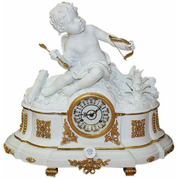 Каминные часы «Путешествие во времени» — воплощение идеала ампирной эстетики, где строгость формы сочетается с одухотворённой легкостью образа. Белоснежный фарфор, украшенный золочёными акцентами, создаёт игру света, подчёркивая каждый рельеф и изгиб композиции. Главный акцент — фигура младенца-амура, пленённого мгновением: стрелы любви ещё не пущены, но замысел уже затаён во взгляде. Его поза — не просто декоративный жест, а аллегория выбора, движения, внутреннего пути.