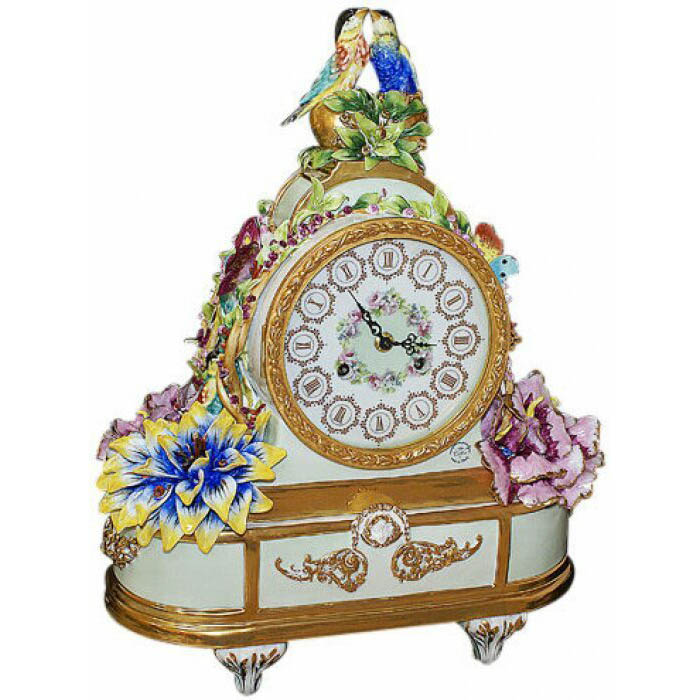 Каминные часы «Сладкое пробуждение» — это не просто часовой механизм, а фарфоровая ода любви, весне и свету. Центром композиции выступает круглый циферблат, обрамлённый позолоченным венком, украшенный гирляндами нежных роз и лавровых листьев. Цифры выполнены в стиле эпохи Людовика XV, лёгкие стрелки изящно скользят по тонкому фарфору, сохраняя гармонию между временем и эстетикой. Над циферблатом — пара трепетных птичек, склонённых друг к другу в поцелуе, — воплощение чувства, возникающего вне календарей и расписаний.