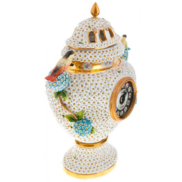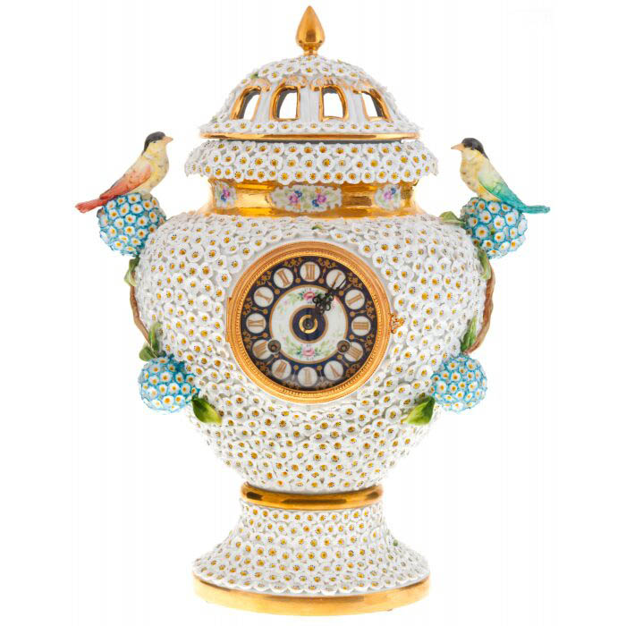 Каминные часы «Танец времени» выполнены в форме фарфорового сосуда, усыпанного тысячами крошечных цветов, подобно бескрайнему полю ромашек под летним небом. Белоснежная поверхность усыпана миниатюрными бутонами с золотыми сердцевинами, создающими сияющее, едва уловимое мерцание. На широком корпусе, дополненном роскошной позолоченной окантовкой, расположены скульптурные композиции: две птички с трепетно проработанными перьями в нежных пастельных тонах восседают на ветвях, украшенных цветами небесно-голубого оттенка. Круглый циферблат с ажурной росписью, обрамлённый золотистым венком, завершает картину утончённого совершенства.