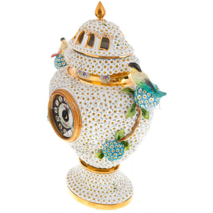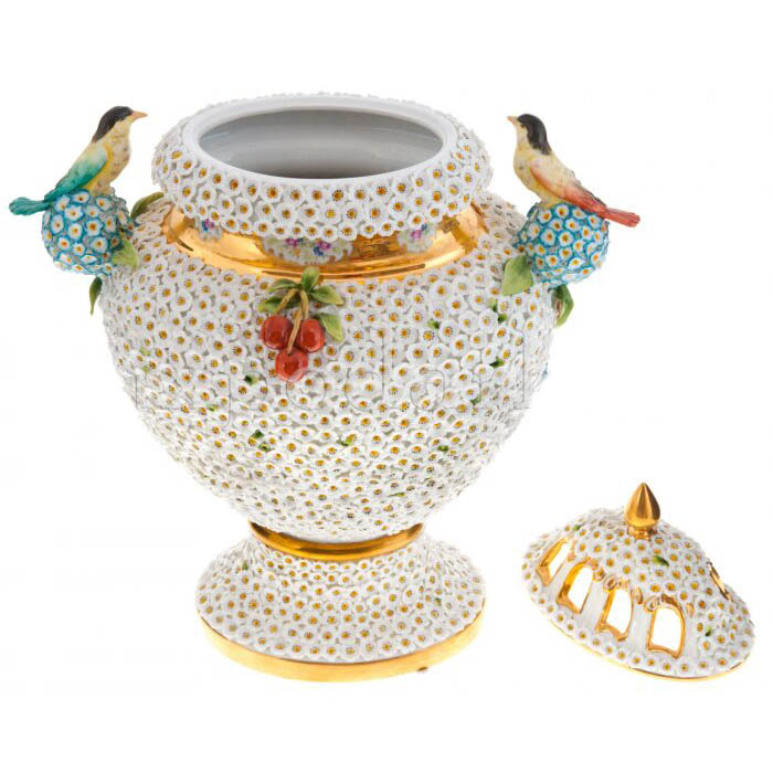 Тщательная лепка, филигранная роспись, изысканная работа с глазурью — каждую деталь наполняет дух живой природы. Съёмная крышка, декорированная арочными прорезями и золотым шпилем, открывает просторное внутреннее пространство, превращая изделие в сочетание художественного объекта и функционального предмета. Фарфор словно дышит теплом лета, свежестью цветущего сада и лёгким шелестом крыльев птиц, а золотые акценты наполняют композицию внутренним светом и благородством.