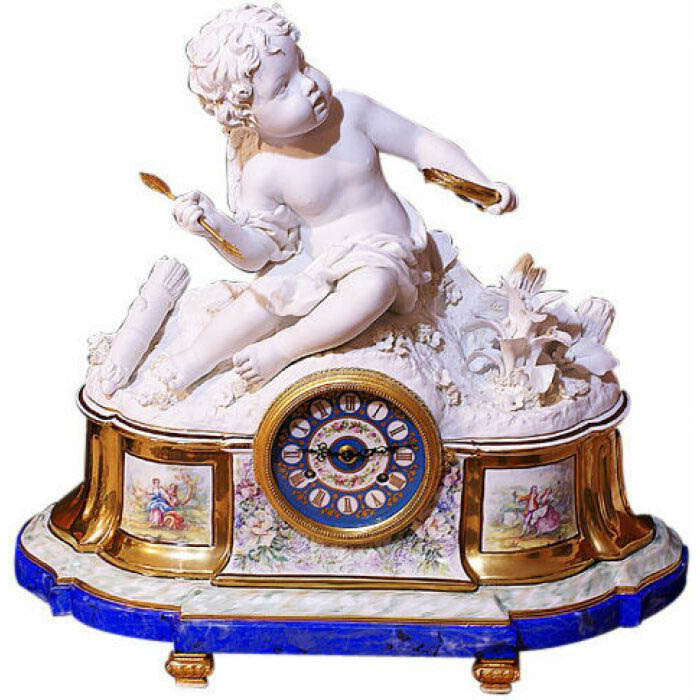 Основание часов инкрустировано росписями в романтическом духе: женские фигуры на боковых вставках словно иллюстрируют мифы и легенды, передающиеся в атмосфере европейского салона XVIII века. Глубокий синий и бирюзовый оттенки подножия, выполненного из лазурита и яшмы, создают ощущение королевской эмали, а позолоченные ножки и обрамление приближают композицию к ювелирному искусству. Циферблат оформлен витиеватым орнаментом и цветочной росписью — временем здесь измеряется не бегущими минутами, а внутренним созерцанием.