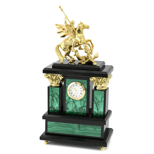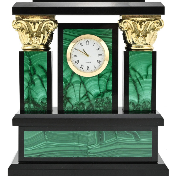 Каминные часы-шкатулка из змеевика "Птицы" ЗлатоустКаминные часы-шкатулка из змеевика "Птицы" ЗлатоустКаминные часы, вырезанные из уральского змеевика и декорированные позолоченными деталями, представляют собой не просто предмет интерьера, а настоящую коллекционную ценность для эстета. На пьедестале, обрамлённом четырьмя колоннами, расположилась композиция из двух экзотических птиц, выточенных из металла с ювелирной тщательностью и инкрустированных натуральными камнями: глубокий черный оникс подчёркивает массивность корпуса одной птицы, а насыщенный зелёный нефрит отсылает к природной цветовой палитре другой. На фронтальной части пьедестала расположены два выдвижных ящика, аккуратно встроенных в конструкцию, и украшенных золочёными накладками с растительным орнаментом. Часы венчает арочный корпус, в который вмонтирован циферблат немецкой марки Hermle с классическими римскими цифрами.