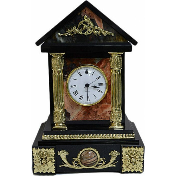 Каминные часы-шкатулка из змеевика "Птицы" ЗлатоустКаминные часы-шкатулка из змеевика "Птицы" ЗлатоустКаминные часы, вырезанные из уральского змеевика и декорированные позолоченными деталями, представляют собой не просто предмет интерьера, а настоящую коллекционную ценность для эстета. На пьедестале, обрамлённом четырьмя колоннами, расположилась композиция из двух экзотических птиц, выточенных из металла с ювелирной тщательностью и инкрустированных натуральными камнями: глубокий черный оникс подчёркивает массивность корпуса одной птицы, а насыщенный зелёный нефрит отсылает к природной цветовой палитре другой. На фронтальной части пьедестала расположены два выдвижных ящика, аккуратно встроенных в конструкцию, и украшенных золочёными накладками с растительным орнаментом. Часы венчает арочный корпус, в который вмонтирован циферблат немецкой марки Hermle с классическими римскими цифрами.