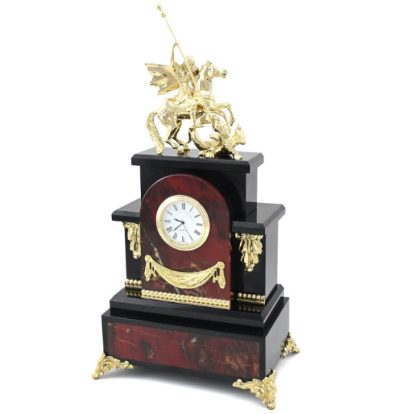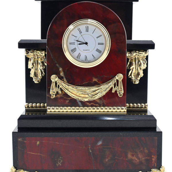 Каминные часы-шкатулка из змеевика "Птицы" ЗлатоустКаминные часы-шкатулка из змеевика "Птицы" ЗлатоустКаминные часы, вырезанные из уральского змеевика и декорированные позолоченными деталями, представляют собой не просто предмет интерьера, а настоящую коллекционную ценность для эстета. На пьедестале, обрамлённом четырьмя колоннами, расположилась композиция из двух экзотических птиц, выточенных из металла с ювелирной тщательностью и инкрустированных натуральными камнями: глубокий черный оникс подчёркивает массивность корпуса одной птицы, а насыщенный зелёный нефрит отсылает к природной цветовой палитре другой. На фронтальной части пьедестала расположены два выдвижных ящика, аккуратно встроенных в конструкцию, и украшенных золочёными накладками с растительным орнаментом. Часы венчает арочный корпус, в который вмонтирован циферблат немецкой марки Hermle с классическими римскими цифрами.