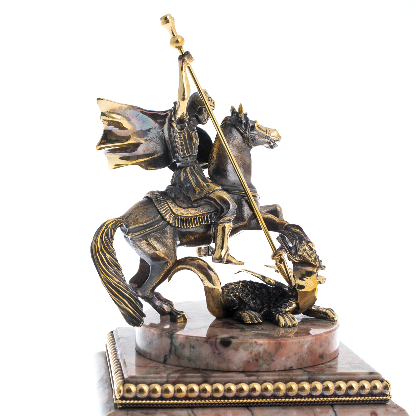 Каминные часы "Статус. Георгий Победоносец" — это не просто инструмент для измерения времени, это воплощение вечных ценностей, символов силы и победы. На вершине этой изысканной композиции возвышается фигура Георгия Победоносца, героя, олицетворяющего торжество света над тьмой, добра над злом. В его руке сверкает копье, поражающее поверженного дракона. Каждый элемент скульптуры — от мощных мускулов боевого скакуна до парящего плаща, словно застывшего в вихре битвы, — воспевает победу и несгибаемую волю.