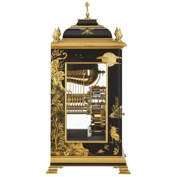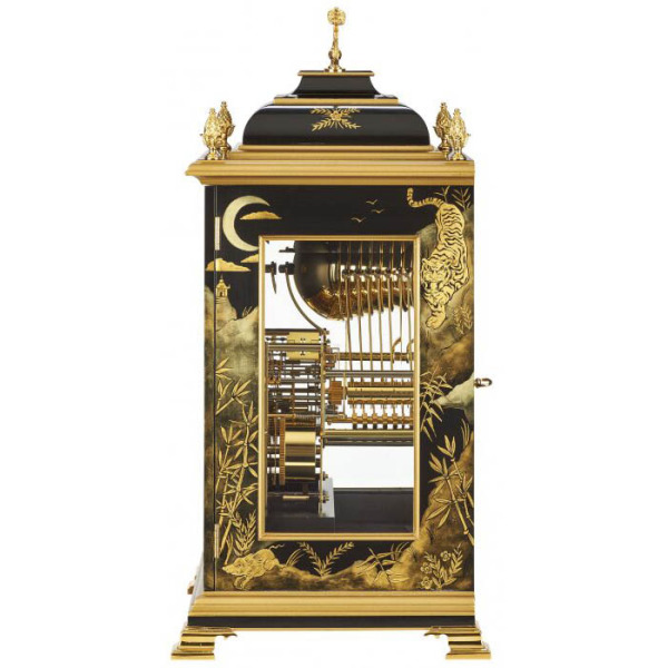Истинное воплощение аристократического величия, эти часы — произведение искусства, способное укротить саму сущность времени. Их черный лакированный корпус с глубоким глянцевым блеском напоминает ночь, озаренную отблесками золотых созвездий. Уникальная ручная роспись в технике Chinoiserie переносит в мир дальневосточных сказаний, где тигр, сотканный из сусального золота, не просто украшает, а символизирует власть, силу и непоколебимую решимость. Это не просто предмет интерьера, а знак принадлежности к высшему кругу, где искусство служит продолжением личности.
