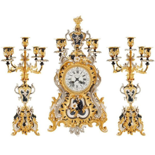 По обе стороны часов, как верные стражи света, возвышаются канделябры, украшая пространство благородным сиянием. Их позолоченные формы напоминают языки пламени, освещающего залы величественных дворцов, а изысканные узоры перекликаются с мотивами сада Эдема, где природа сплеталась с божественным замыслом. Они словно несут в себе тайну света, дарующего уют и вдохновение.