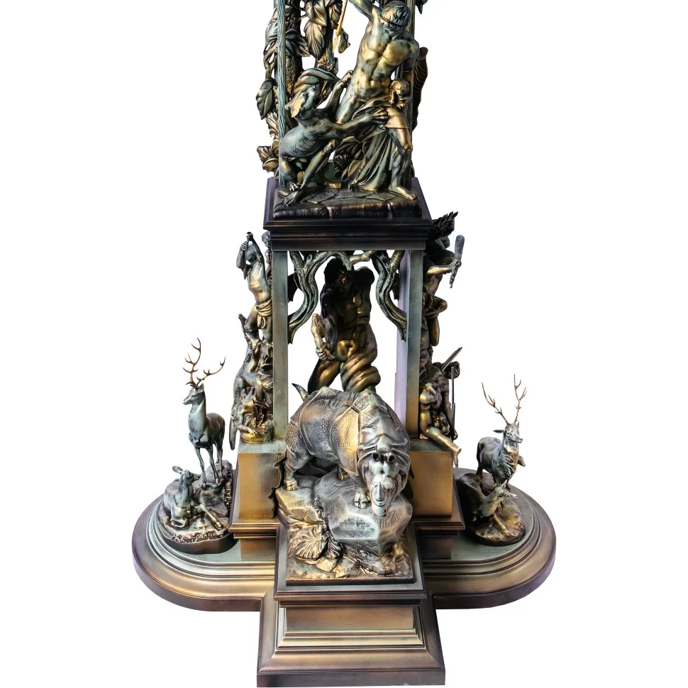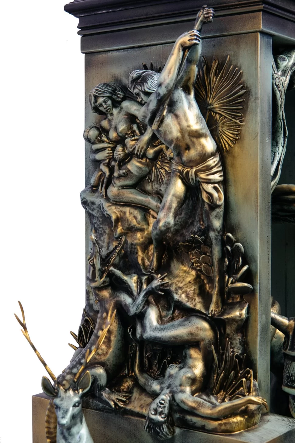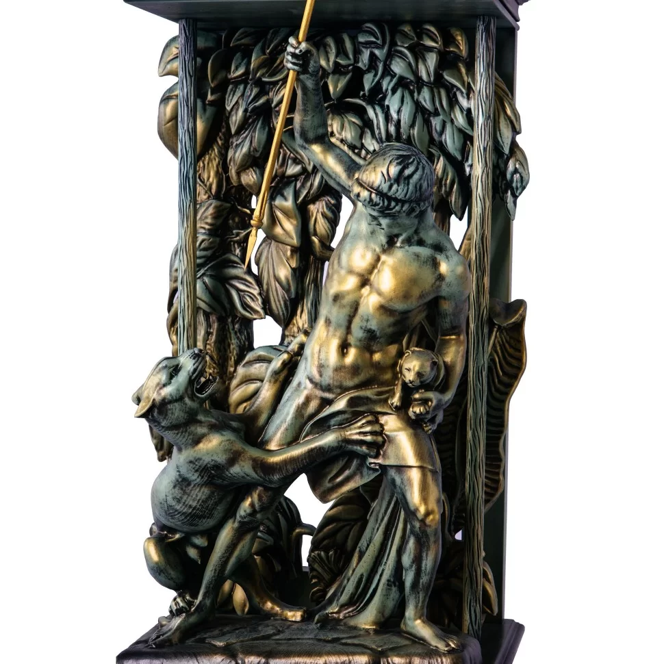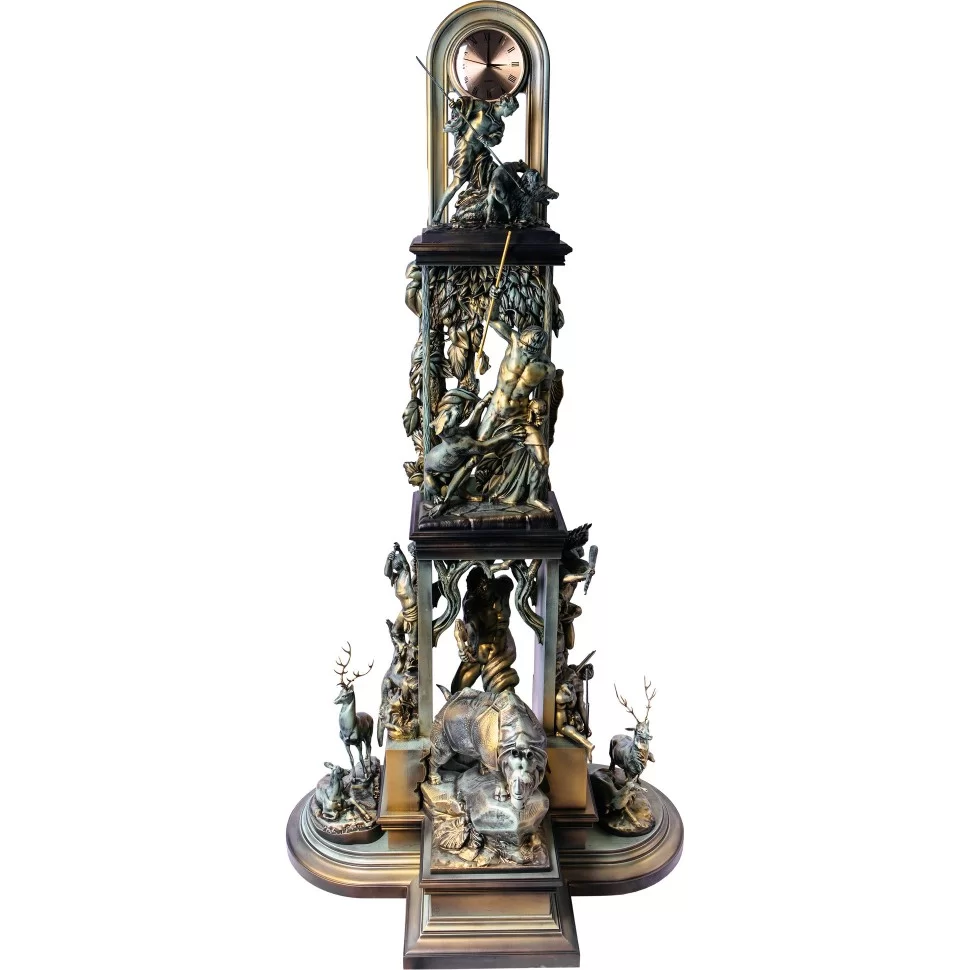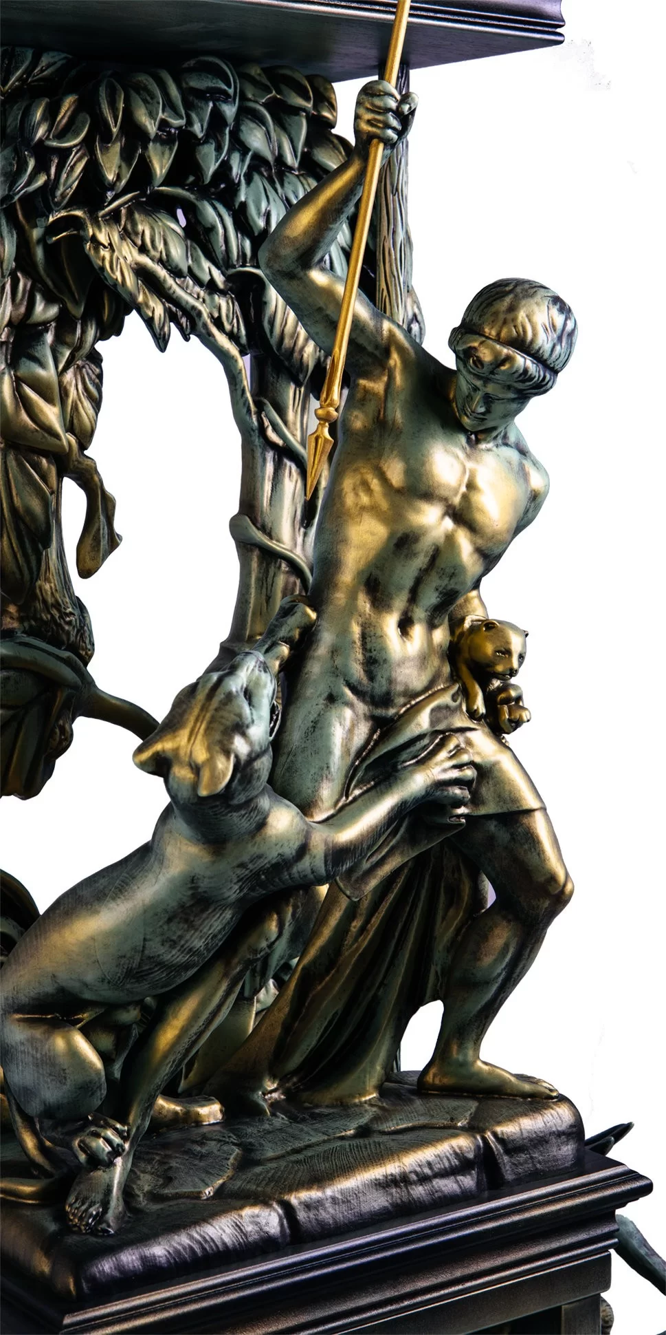 Каждый уровень часов украшен фигурами зверей и мифологических героев, воплощающих силу, выносливость и первозданную энергию. В основании возвышается массивный носорог, символ стойкости и непобедимости. По бокам расположены олени, затаившиеся среди деревьев, напоминая о гармонии между человеком и дикой природой. Висящие в воздухе фигуры охотников и зверей создают ощущение непрерывного движения, словно мгновение застыло во времени. Особую выразительность придаёт патинированная отделка, подчёркивающая глубину фактуры и игру света на поверхности.