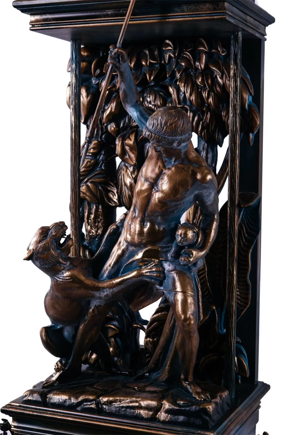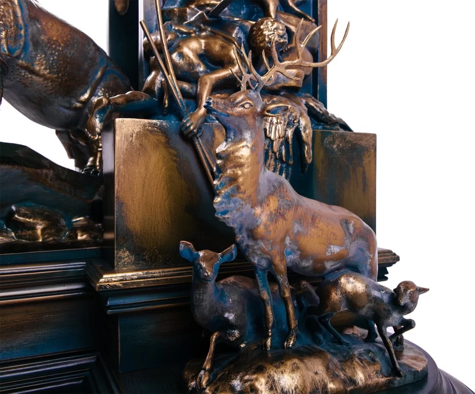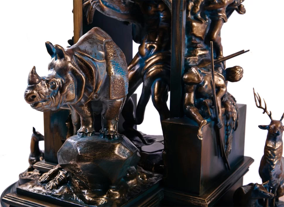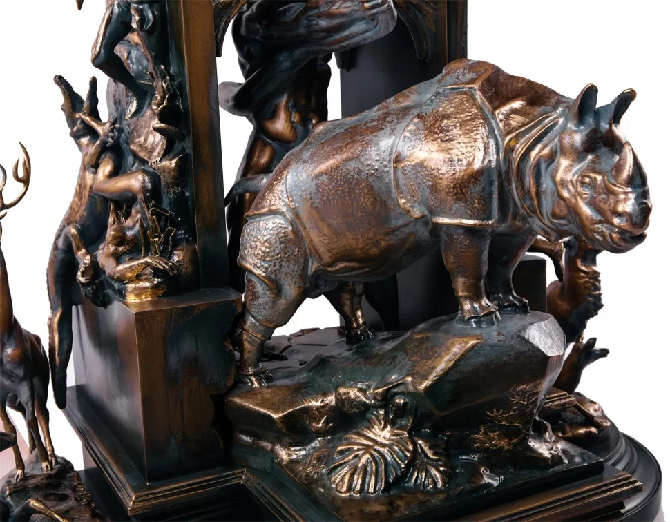 Каждый уровень часов украшен фигурами зверей и мифологических героев, воплощающих силу, выносливость и первозданную энергию. В основании возвышается массивный носорог, символ стойкости и непобедимости. По бокам расположены олени, затаившиеся среди деревьев, напоминая о гармонии между человеком и дикой природой. Висящие в воздухе фигуры охотников и зверей создают ощущение непрерывного движения, словно мгновение застыло во времени. Особую выразительность придаёт патинированная отделка, подчёркивающая глубину фактуры и игру света на поверхности.