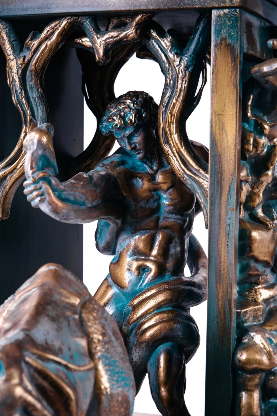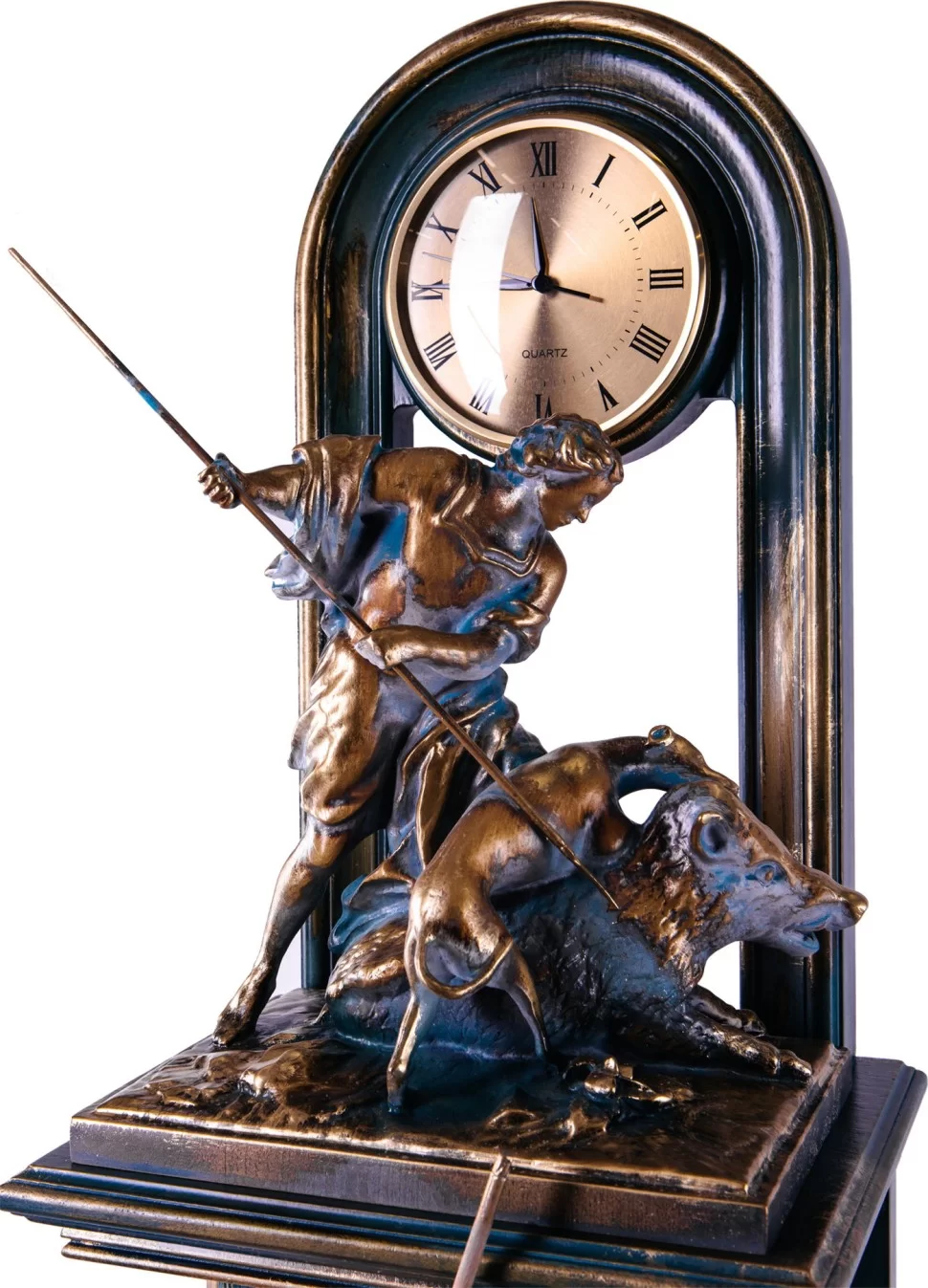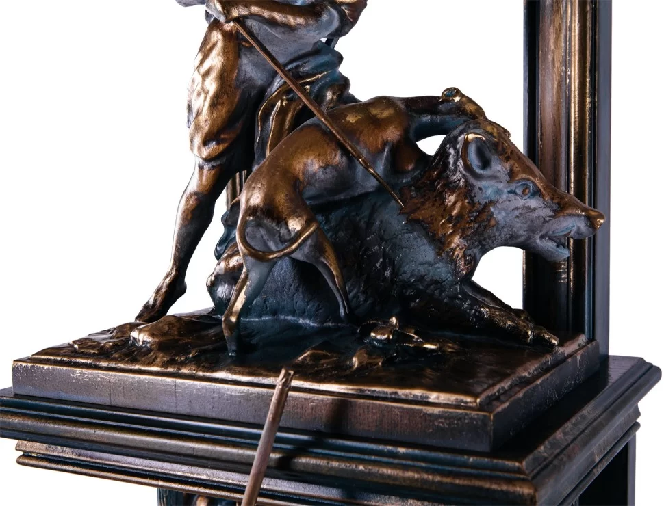Каждый уровень часов украшен фигурами зверей и мифологических героев, воплощающих силу, выносливость и первозданную энергию. В основании возвышается массивный носорог, символ стойкости и непобедимости. По бокам расположены олени, затаившиеся среди деревьев, напоминая о гармонии между человеком и дикой природой. Висящие в воздухе фигуры охотников и зверей создают ощущение непрерывного движения, словно мгновение застыло во времени. Особую выразительность придаёт патинированная отделка, подчёркивающая глубину фактуры и игру света на поверхности.