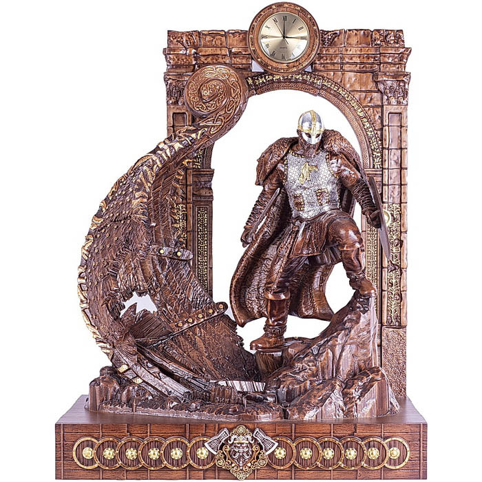 Скульптурная композиция передаёт момент триумфа. Высокая фигура воина, облачённого в кольчугу и боевой плащ, застыла в уверенной позе, словно готового к последнему удару. Лицо скрыто под золотым шлемом с гравировкой, отражающим свет, словно полированный металл. Под его ногами — остатки разрушенного драккара, символ ушедшей эпохи и победы нового времени. Детально проработанная текстура дерева и металлических вставок подчёркивает фактуру брони, одежды и окружения, создавая эффект живого присутствия.