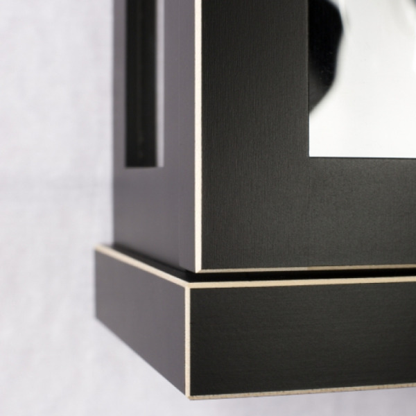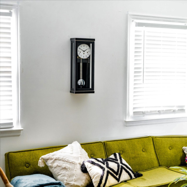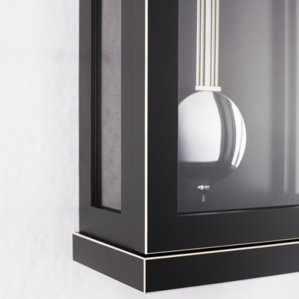 Корпус из массива дерева с контрастными гранями. Боковые стёкла. Модель с мелодией и боем. Длительность завода 8 дней; бой каждый час, мелодия каждые четверть часа; регулятор - маятник. Возможность автоматического и ручного отключения боя и мелодии на ночь.