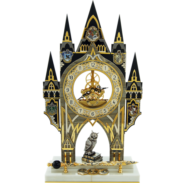 "Гарри Поттер"- популярная серия романов английской писательницы Джоан К.Роулинг. Все книги переведены на множество языков, в том числе и на русский язык. Специально, для любителей этого волшебного мира, наши мастера выполнили работу посвящённую книгам и фильмам о Гарри Поттере. Изделие представляет собой часы, на подставке из белого мрамора. Сами часы в форме башенок различных факультетов. Основание украшает литье совы и ручка.