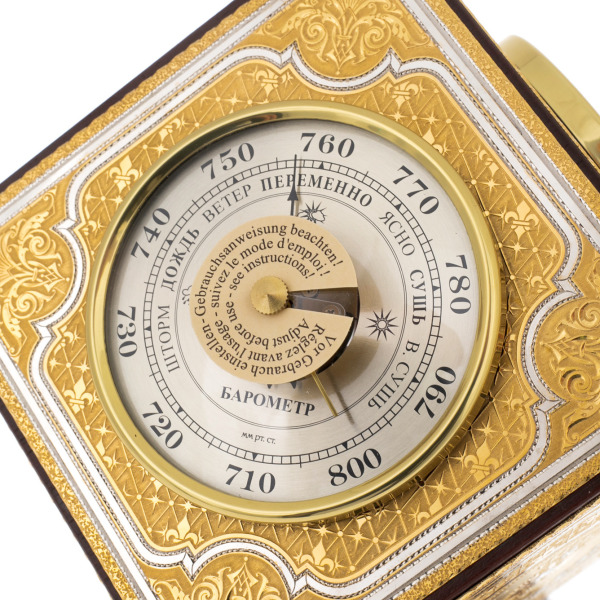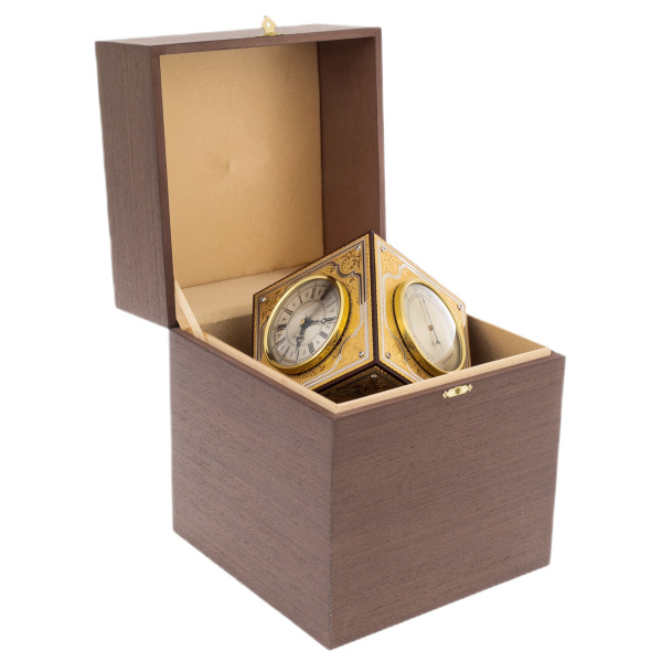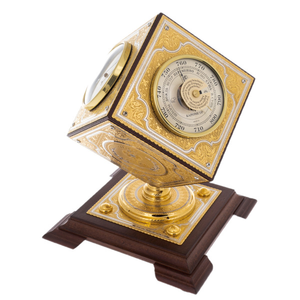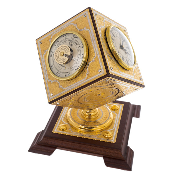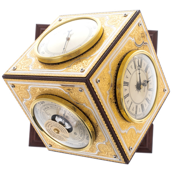 Часы — лишь одна из сторон этого шедевра. Другие грани куба скрывают термометр и барометр, превращая изделие в настоящий инструмент контроля не только надо временем, но и над окружающей средой. Подобное сочетание функциональности и эстетики превращает "Куб" в олицетворение власти над временем и природой, а точность каждого измерения подчеркивает значимость владельца.