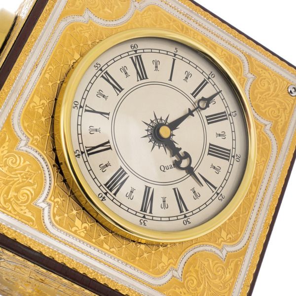 Настольные часы "Куб" от мастеров из Златоуста — это не просто предмет для измерения времени, а настоящий символ престижа и влияния. Массивный куб, покрытый филигранной гравировкой с позолотой, будто парит на основании из натурального дерева, что создает впечатление легкости и воздушности, несмотря на его монументальные формы.