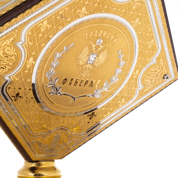 Каждая деталь, от тончайших узоров до четких линий римских цифр на циферблате, выполнена с предельной тщательностью. Орнаменты на золоченых поверхностях напоминают о величии российских традиций, а логотип "Традиции Фаберже" на одной из граней куба акцентирует внимание на безупречном наследии русских ювелиров.
