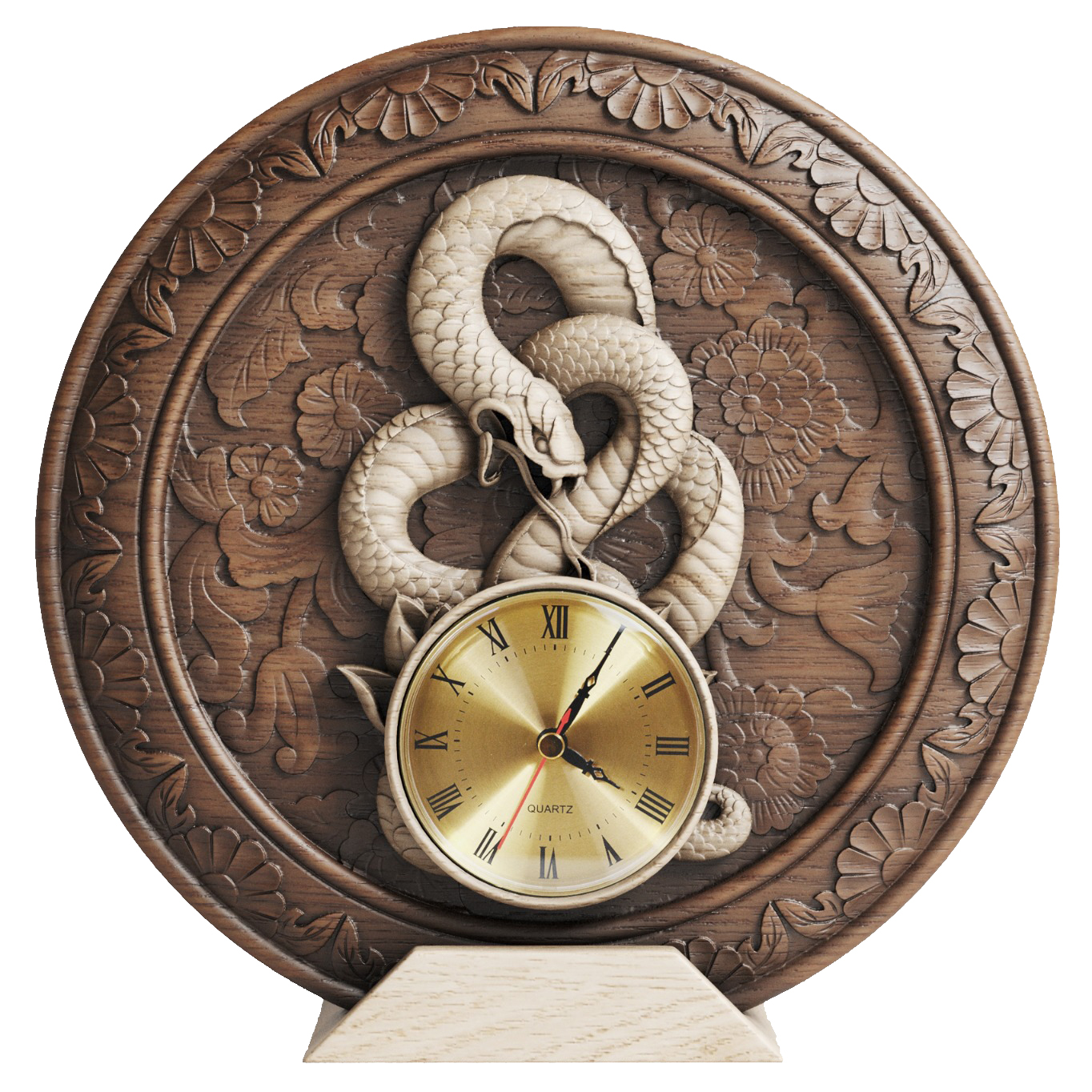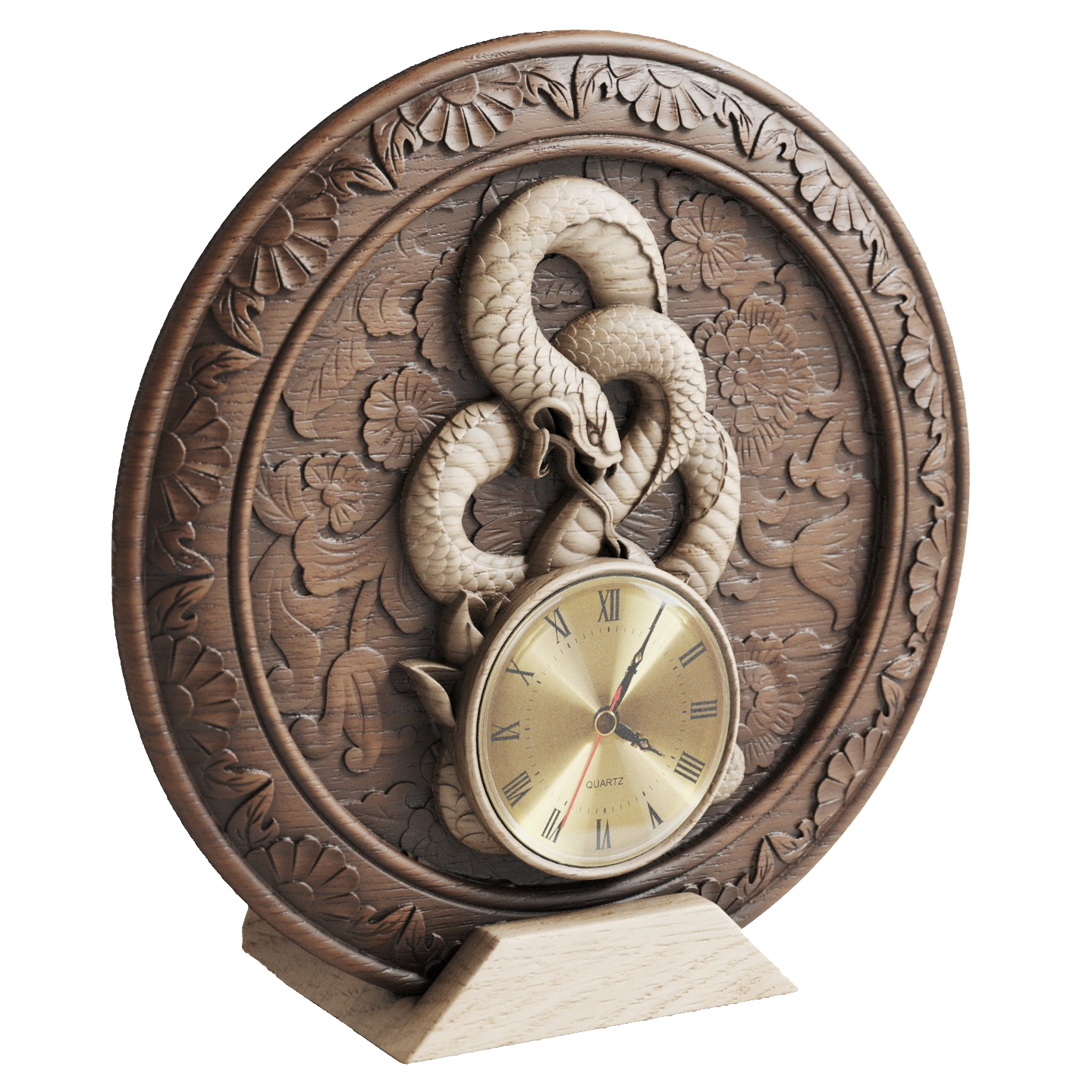 Часы настольные на подставке "Змея" из массива бука — это изысканное произведение искусства, в котором гармонично сочетаются классика и оригинальный дизайн. В центре композиции находится змея, изящно свернувшаяся вокруг корпуса часов. Змея, символизирующая мудрость и вечность, подчёркивает философский смысл течения времени. Тонкие детали резьбы, от текстуры чешуи змеи до орнамента, выполненного на фоне, придают изделию особую выразительность.